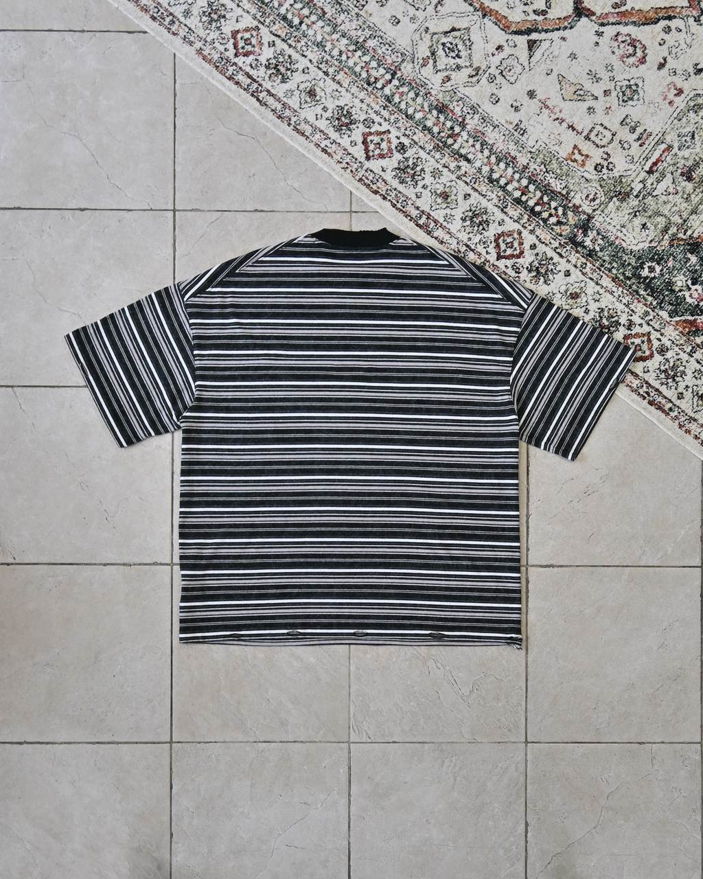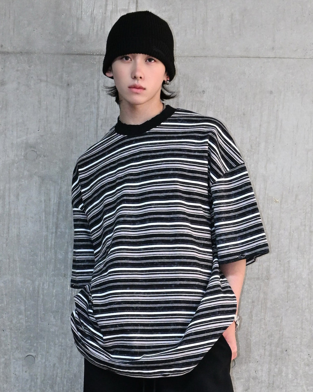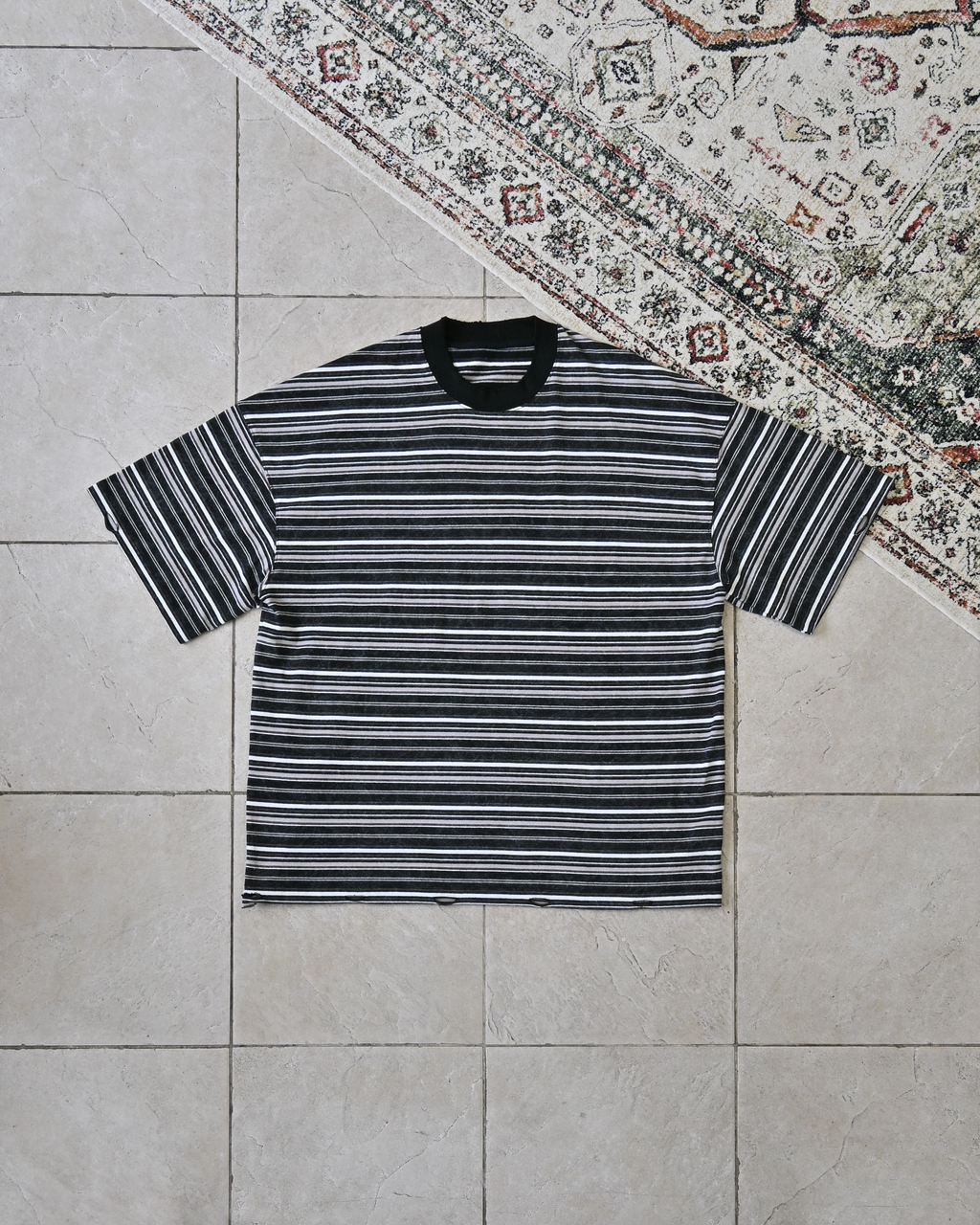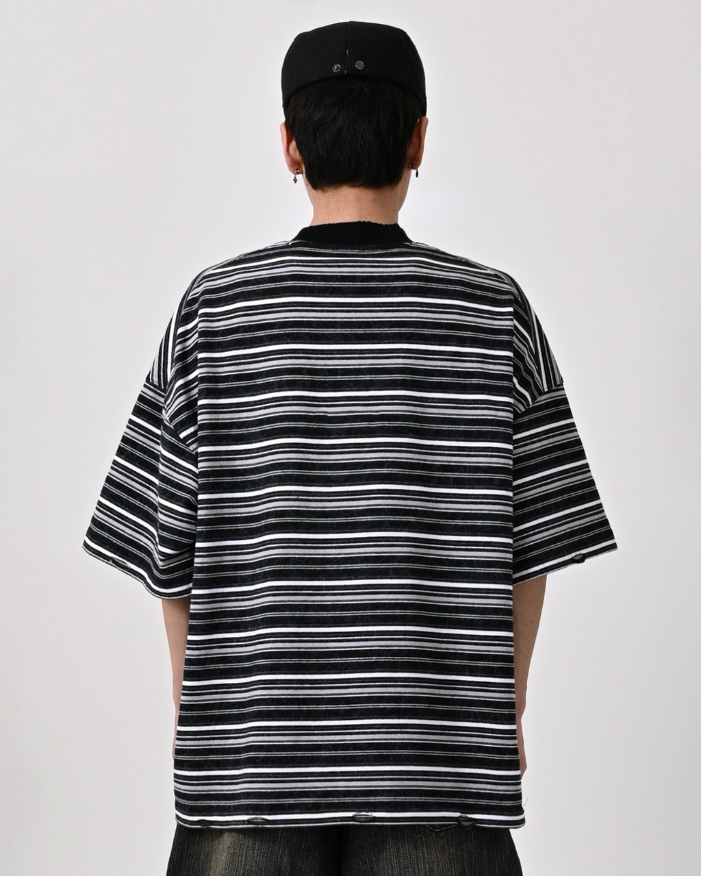 一見ベーシックなボーダー柄ながら、ウォッシュ加工を施してこなれた表情に。裾と首元にはあえてダメージ加工を加え、ヴィンテージライクな雰囲気を演出しています。