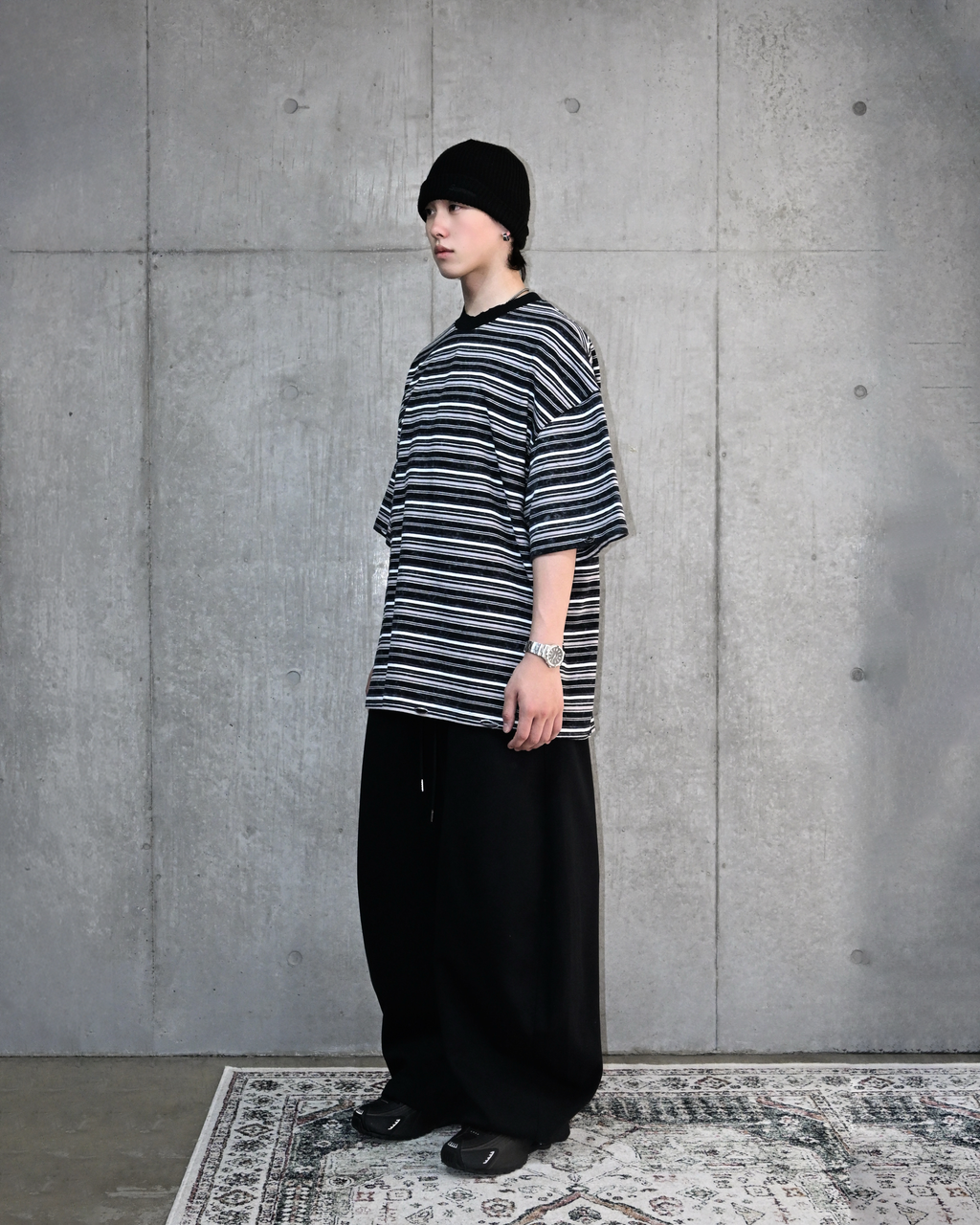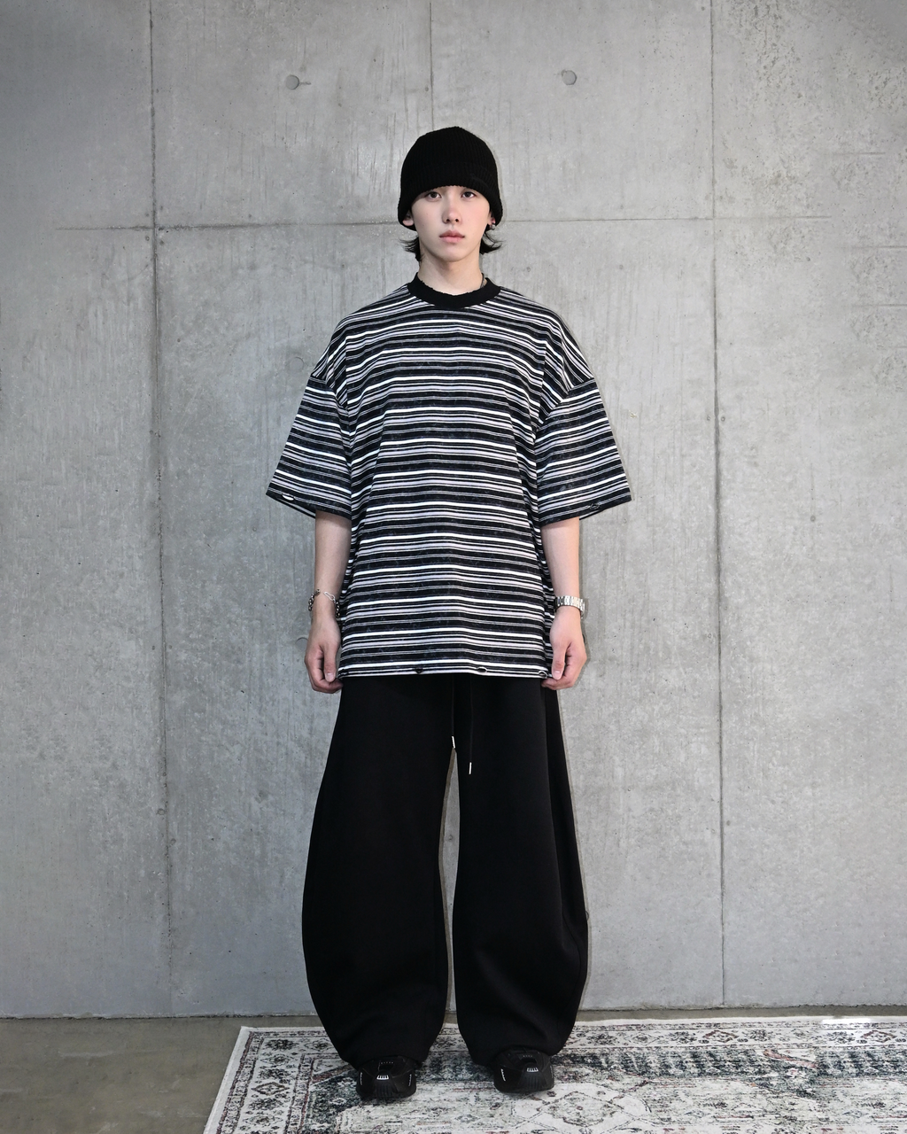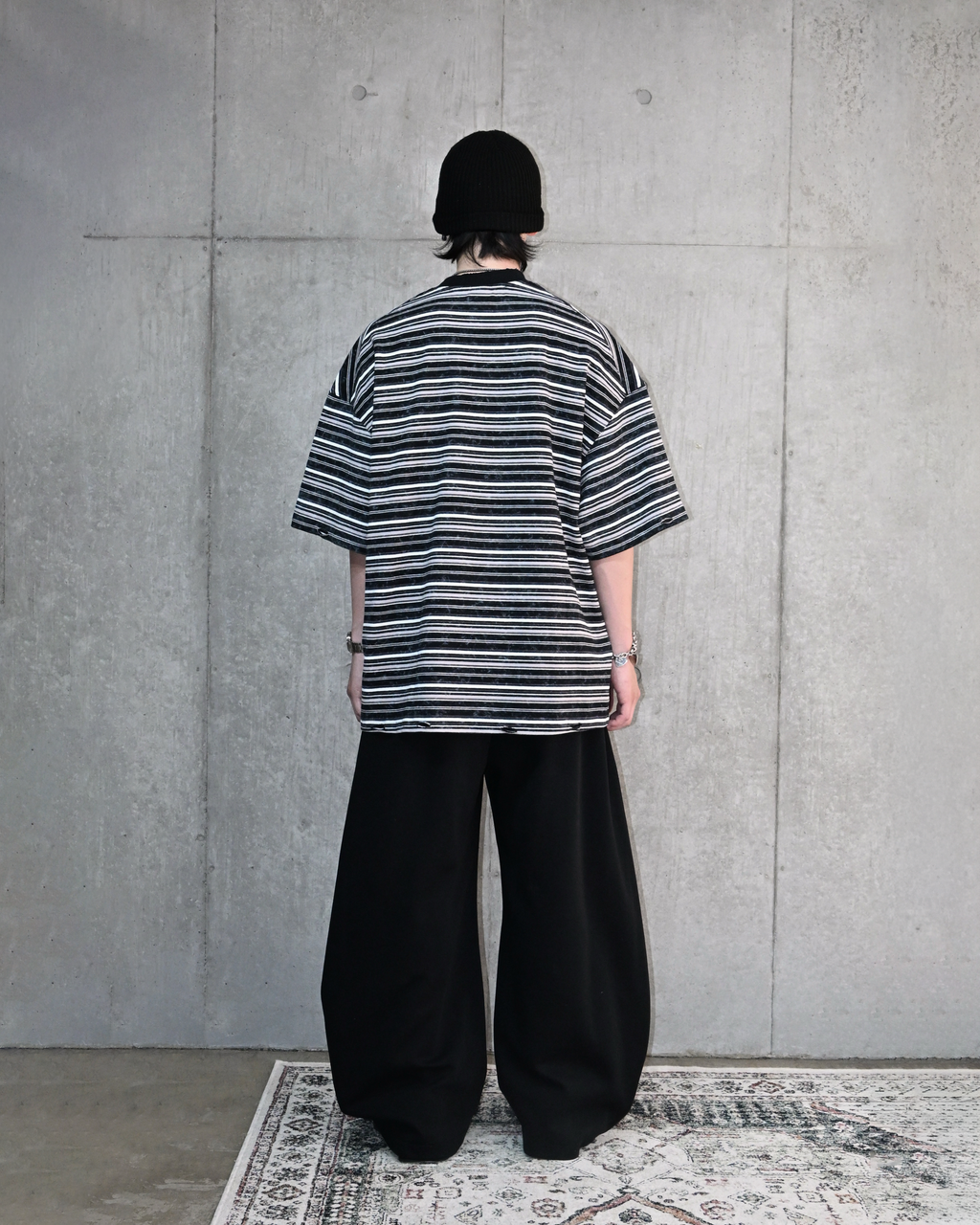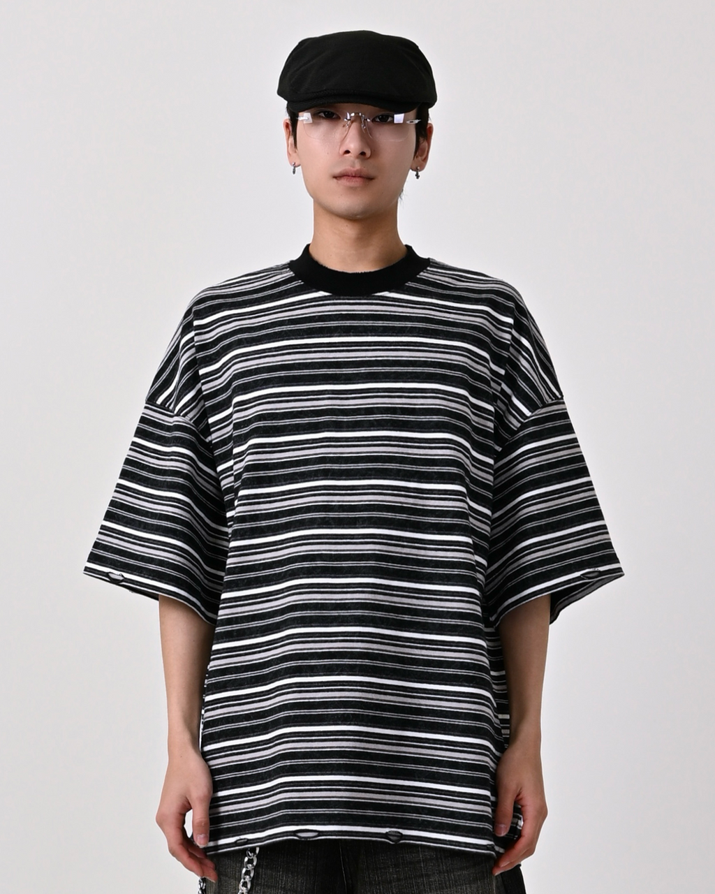一見ベーシックなボーダー柄ながら、ウォッシュ加工を施してこなれた表情に。裾と首元にはあえてダメージ加工を加え、ヴィンテージライクな雰囲気を演出しています。
