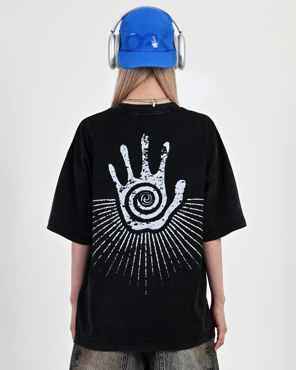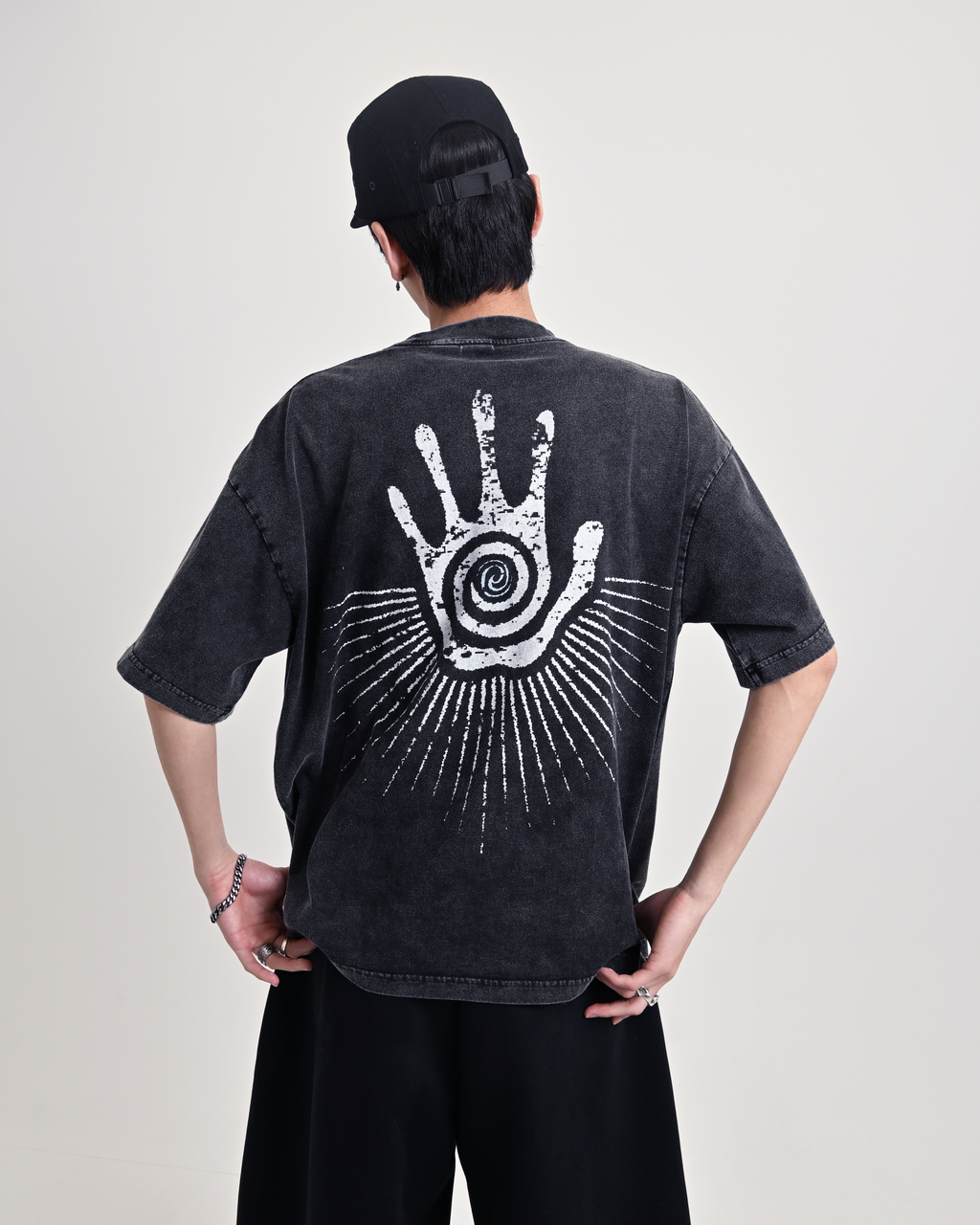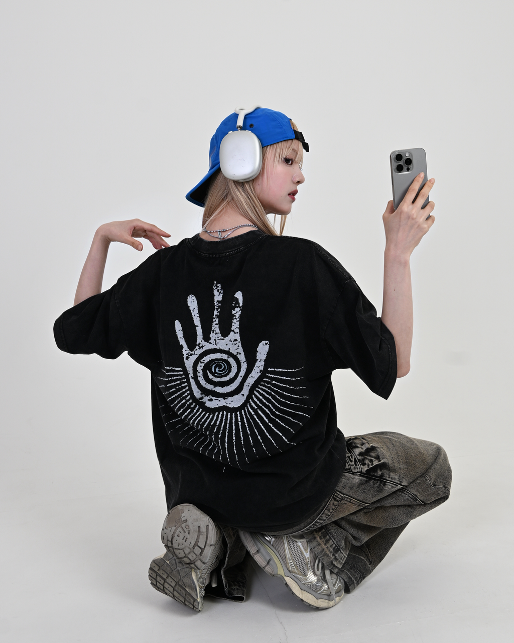 バックには、手のひらと渦をモチーフにした大胆なグラフィック。放射状に広がるラインがインパクトを生み、後ろ姿でもしっかりと存在感を放ちます。