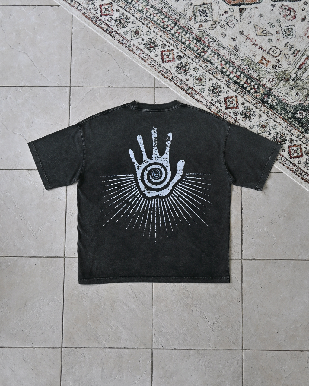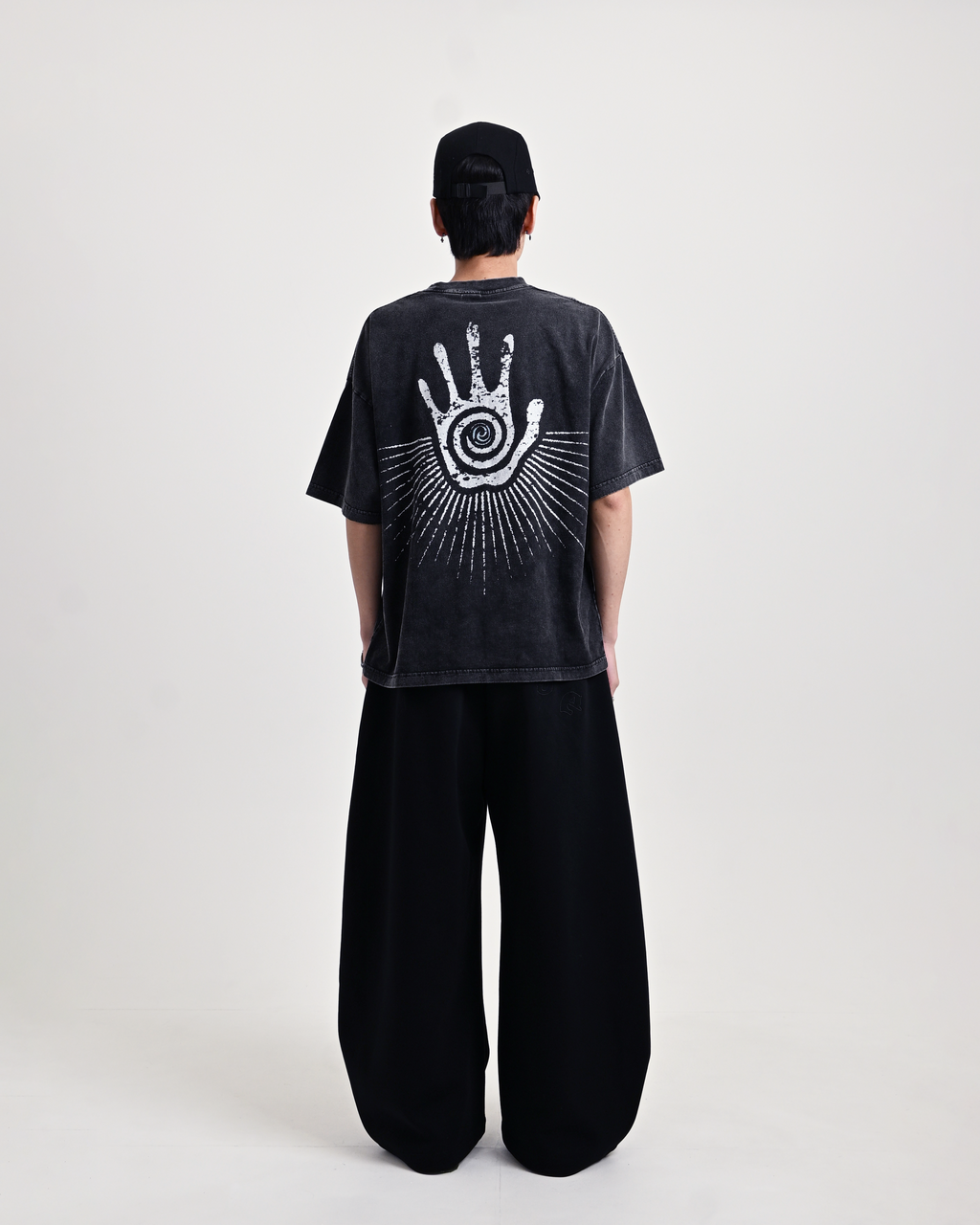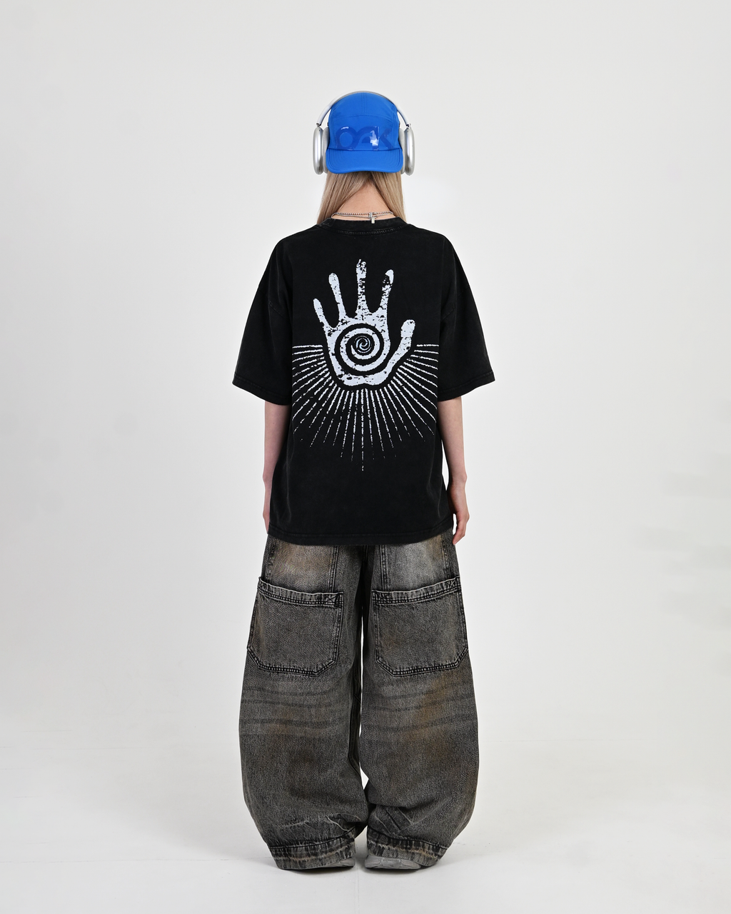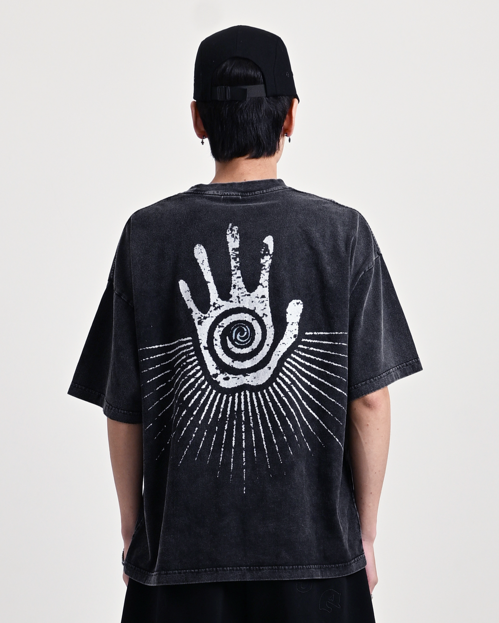 バックには、手のひらと渦をモチーフにした大胆なグラフィック。放射状に広がるラインがインパクトを生み、後ろ姿でもしっかりと存在感を放ちます。