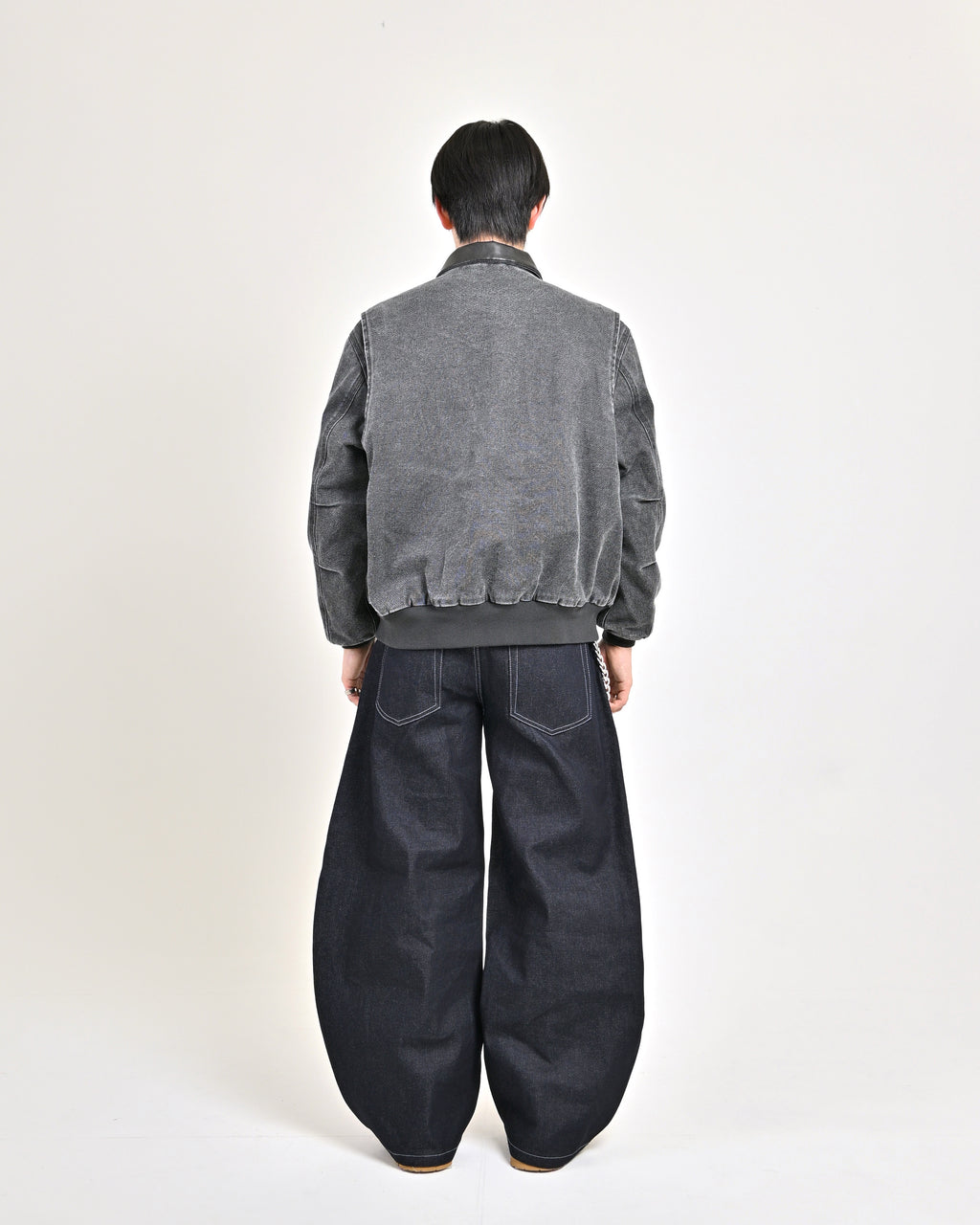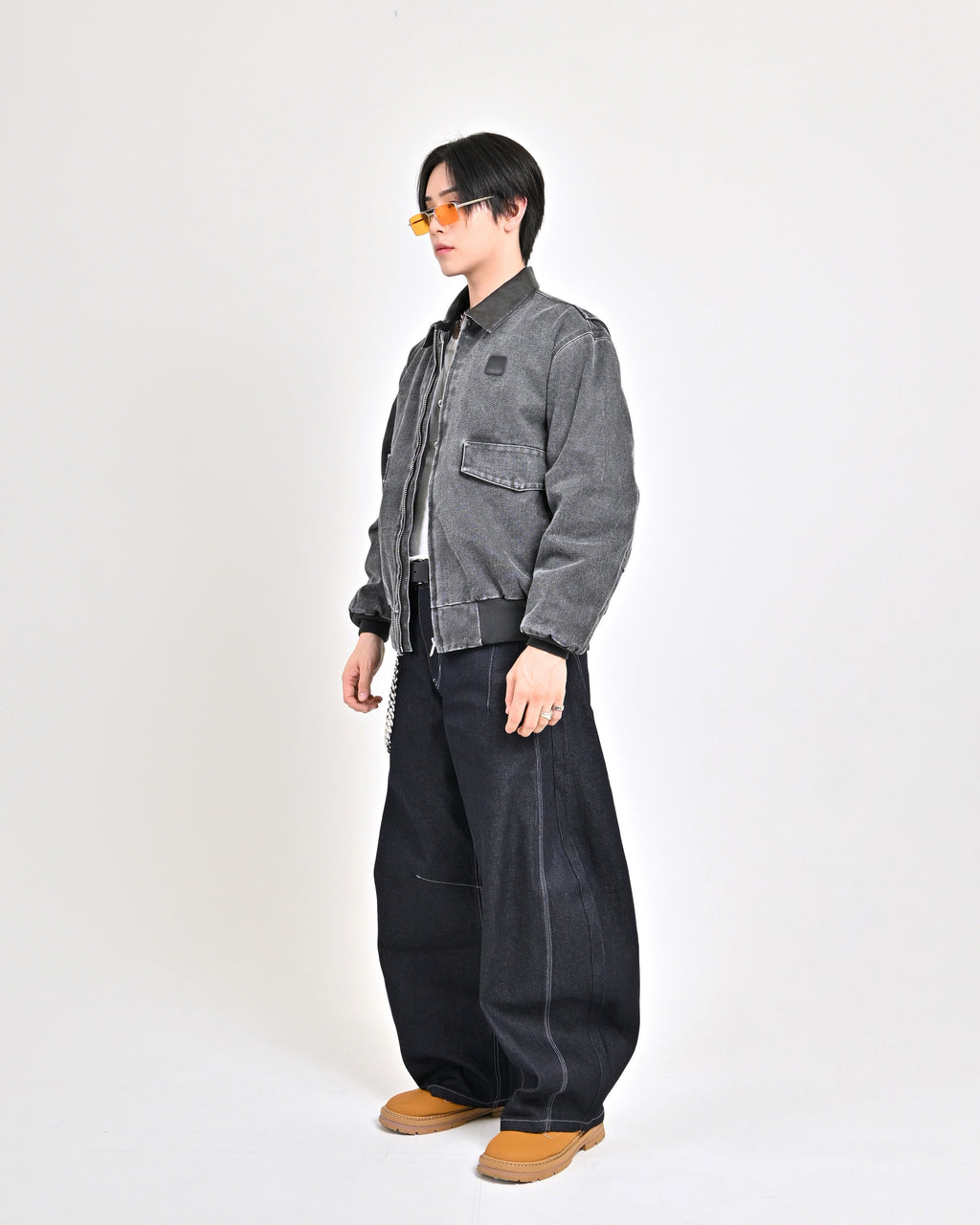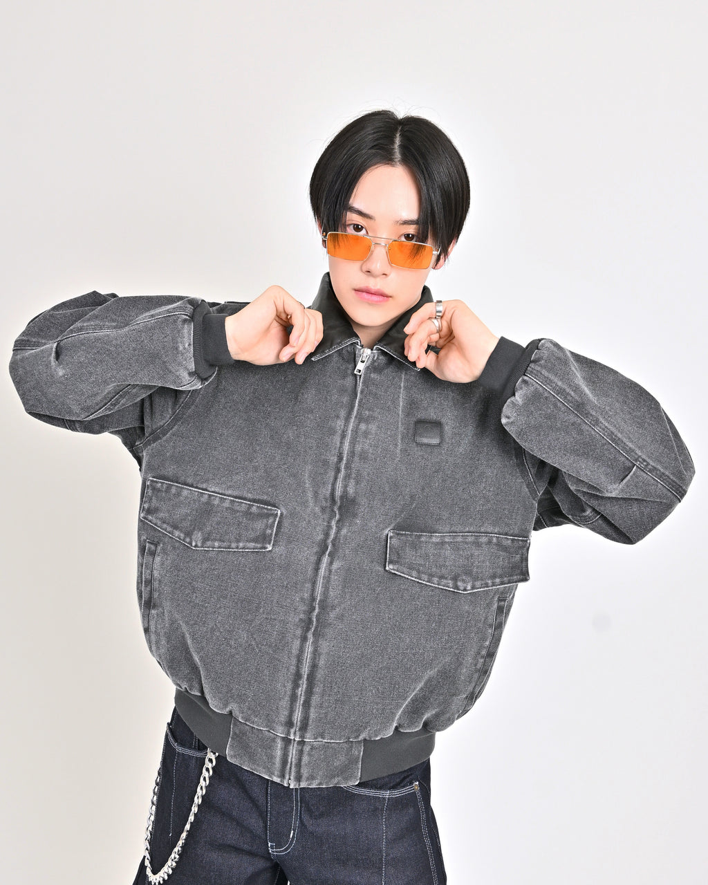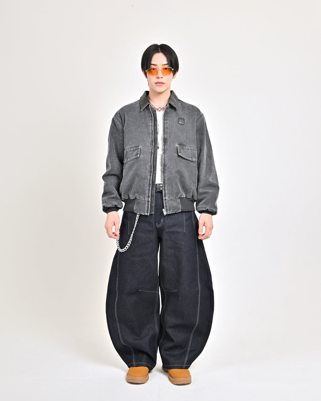 こだわりのウォッシュ加工により、まるで本物のヴィンテージのような深みのある色合いを実現。ロゴにも襟と同じPUレザーを使用し、全体を渋く引き締めています。