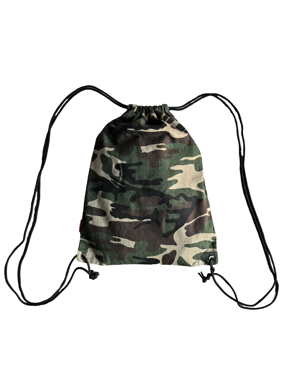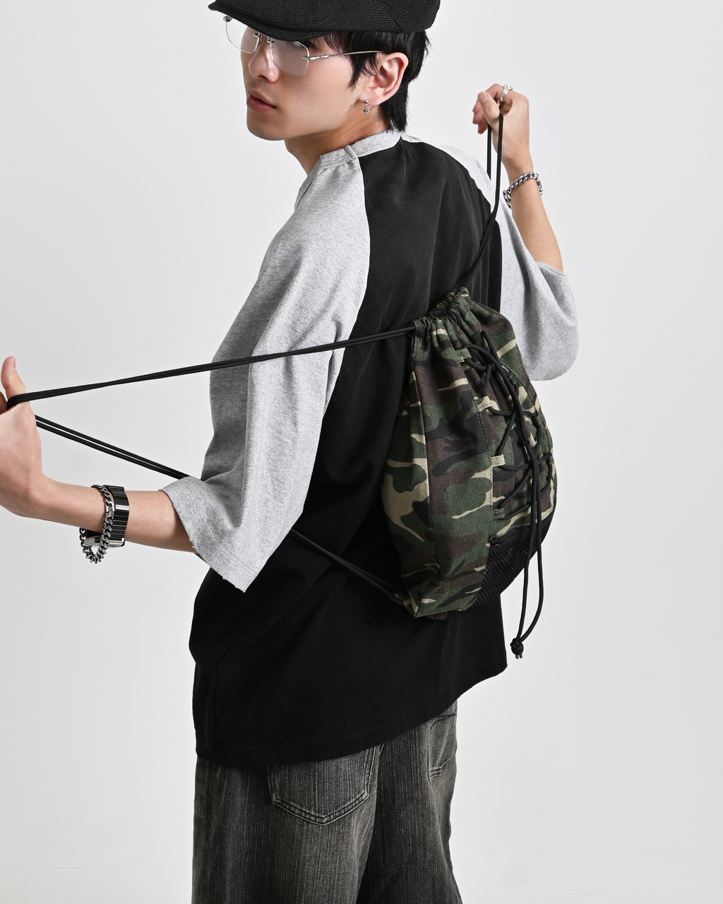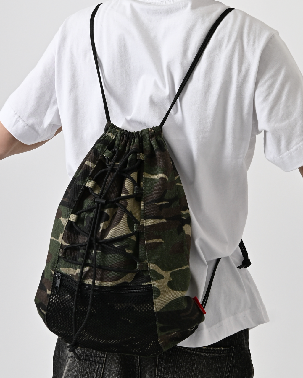 アクセントには、rarelizeの赤タグをワンポイントで。迷彩の中でさりげなく光る“差し色”が、ありきたりなナップザックとの違いを演出。