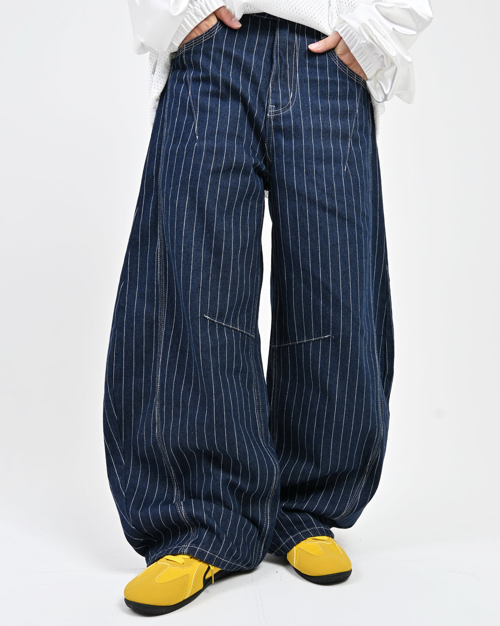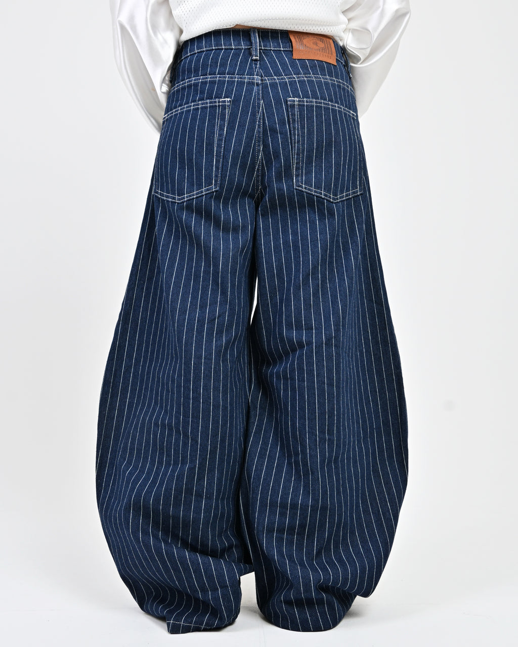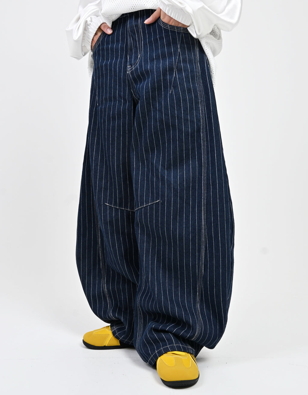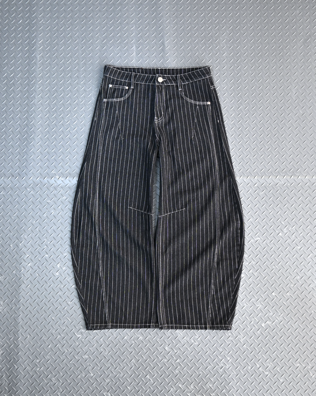 トレンド感のあるストライプデニムに、地底人ONLINEらしいバルーンシルエットを掛け合わせた一本。