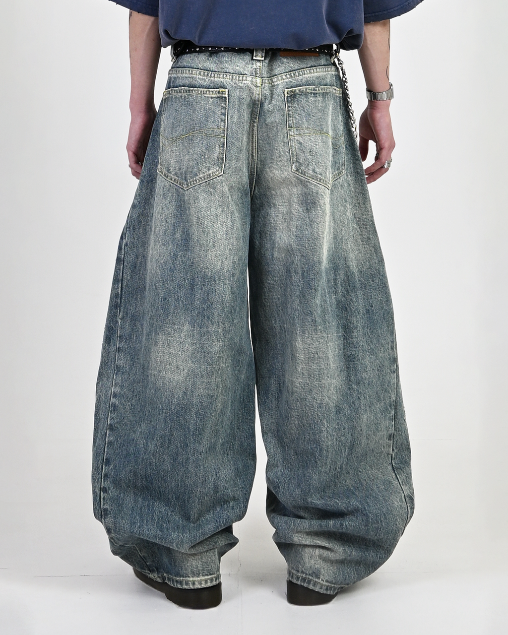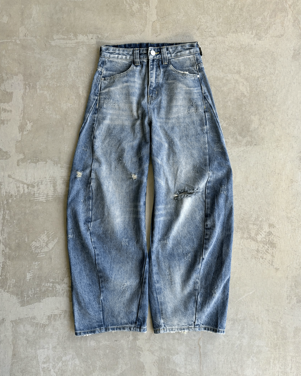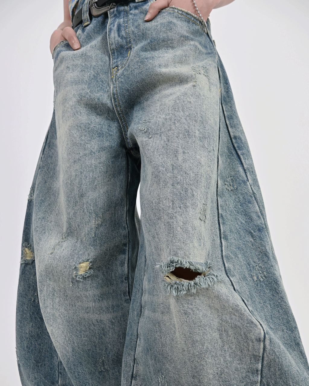 爽やかなライトブルーながら、ほんのりと黄みがかった独特の色味が特徴。さらに、計算されたダメージ加工が絶妙なアクセントとなり、唯一無二の存在感を演出。