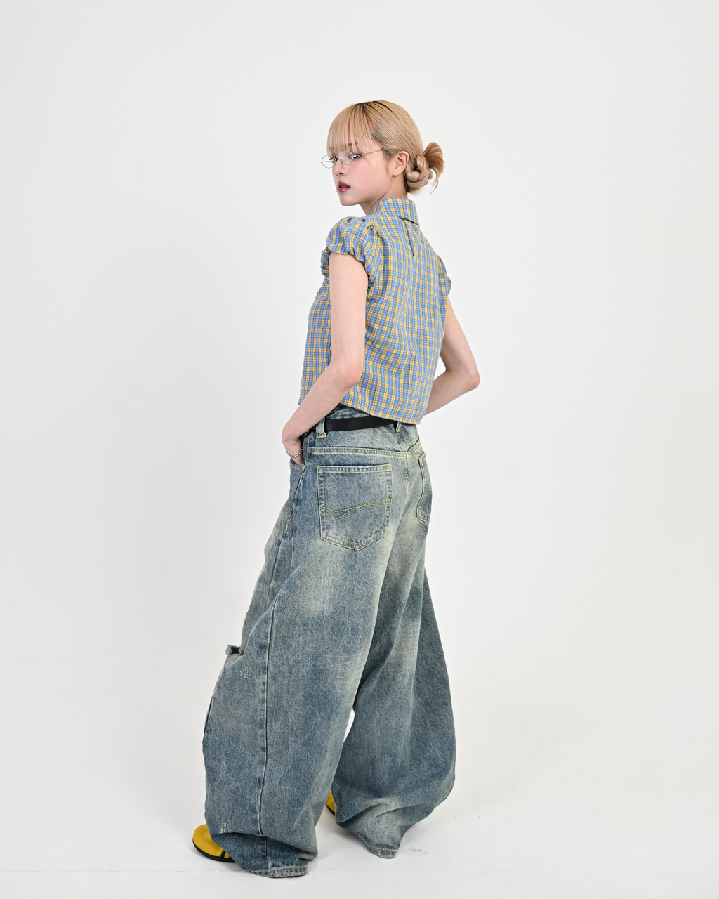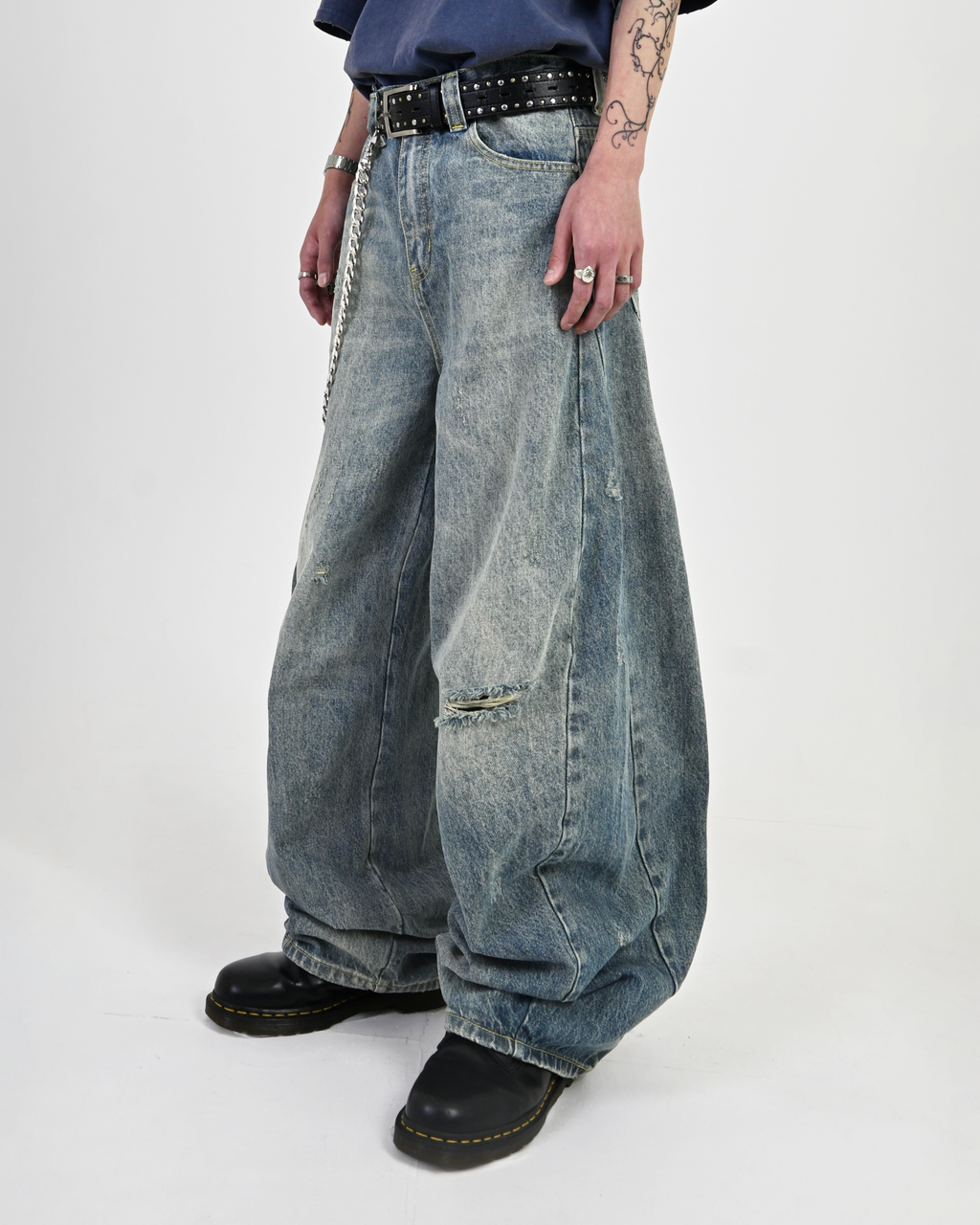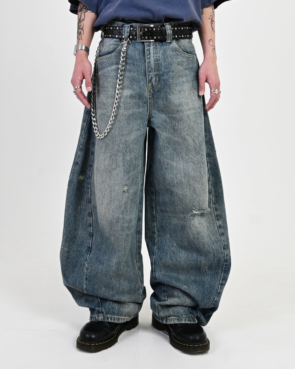 爽やかなライトブルーながら、ほんのりと黄みがかった独特の色味が特徴。さらに、計算されたダメージ加工が絶妙なアクセントとなり、唯一無二の存在感を演出。