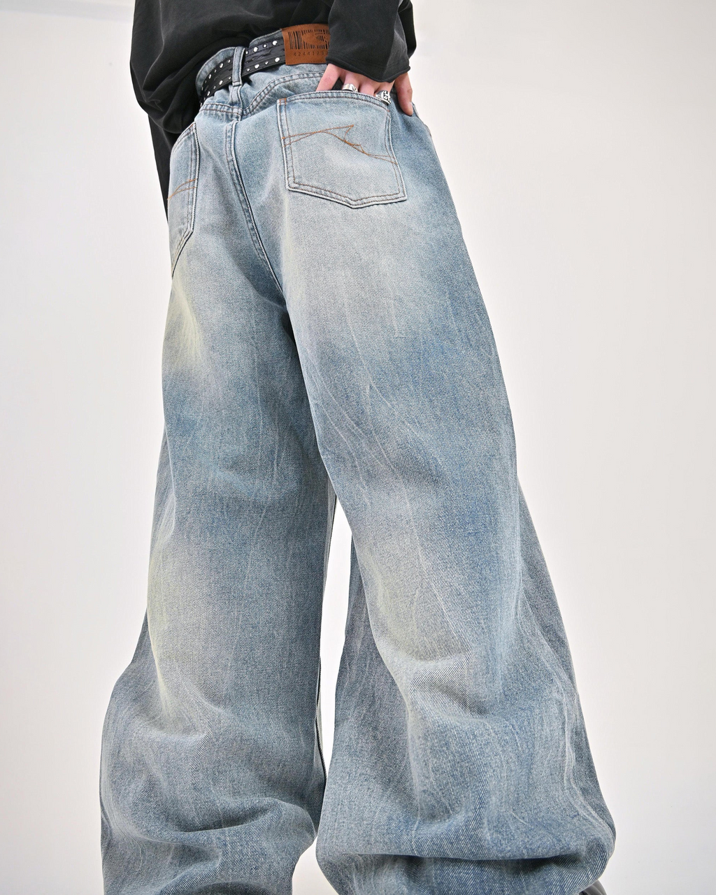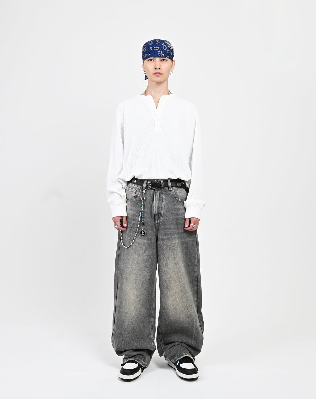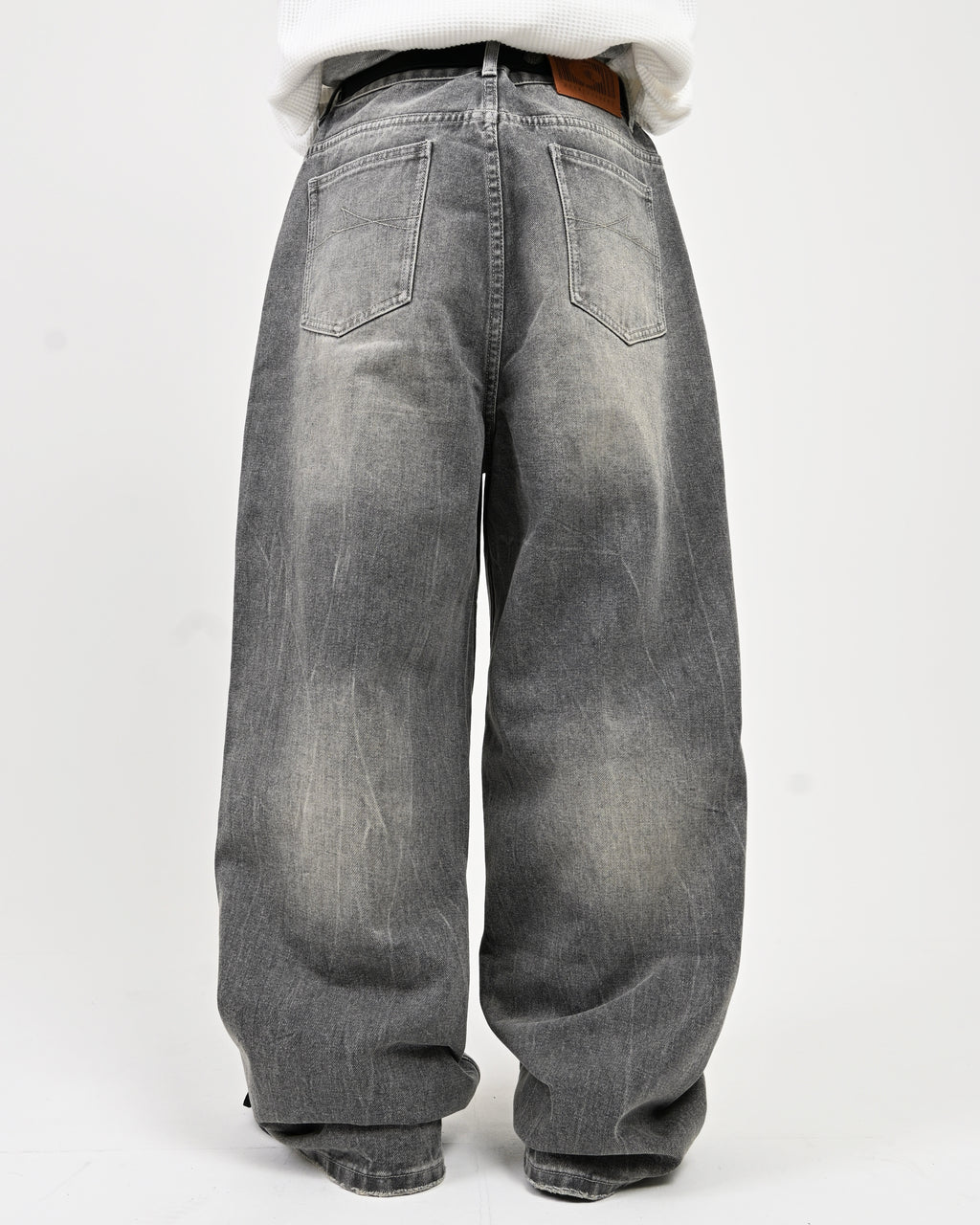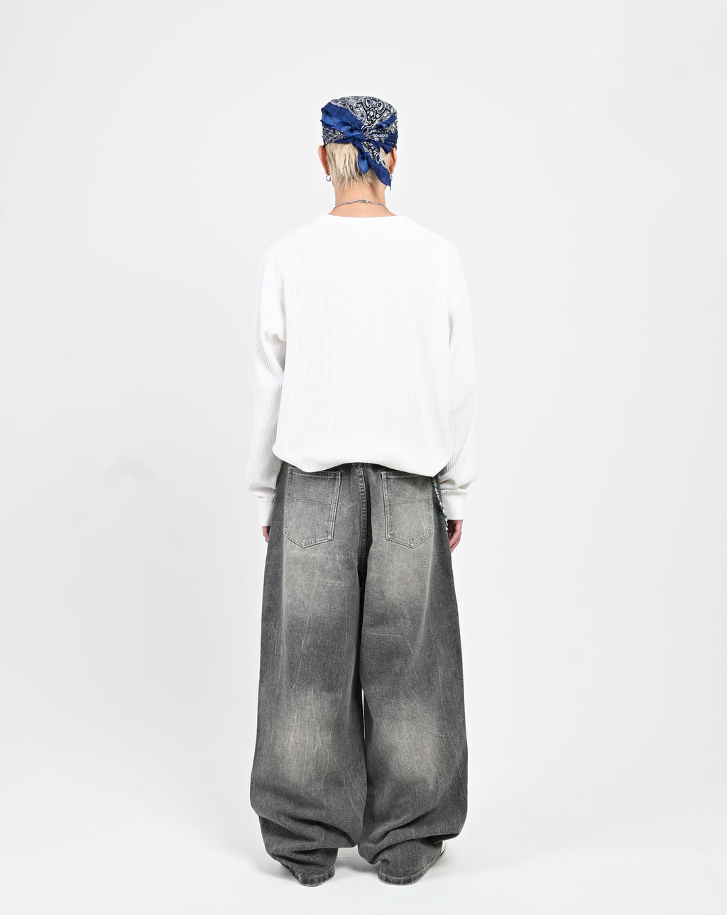 定番のバギーデニムに、黄味がかったウォッシュ加工を施し、さらにクラック加工で雷のようなヒゲを再現。まるで本物のヴィンテージデニムのような奥行きのある色合いに仕上げました。
