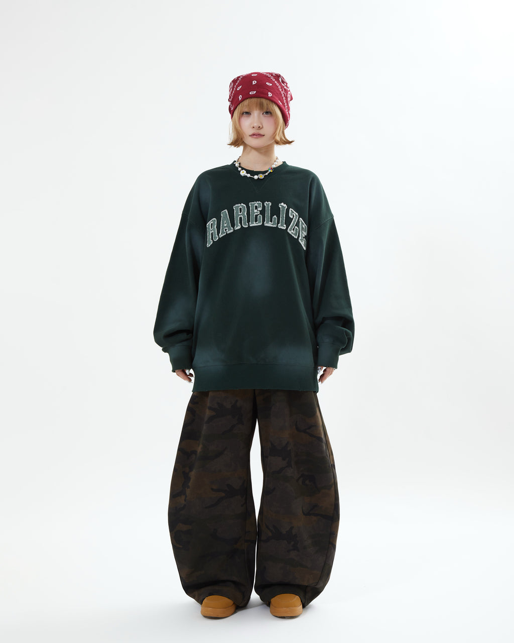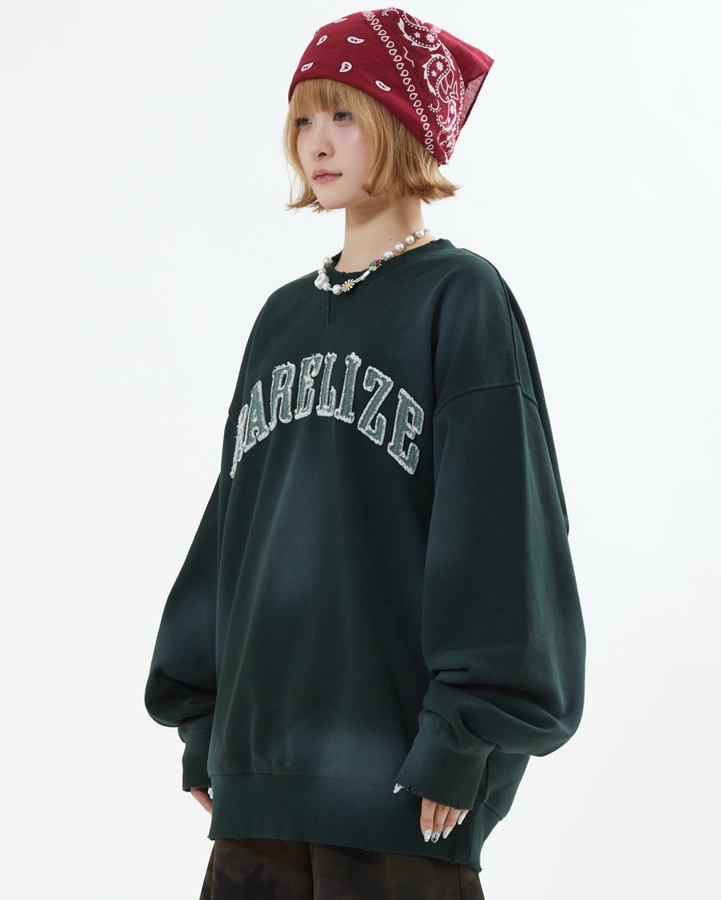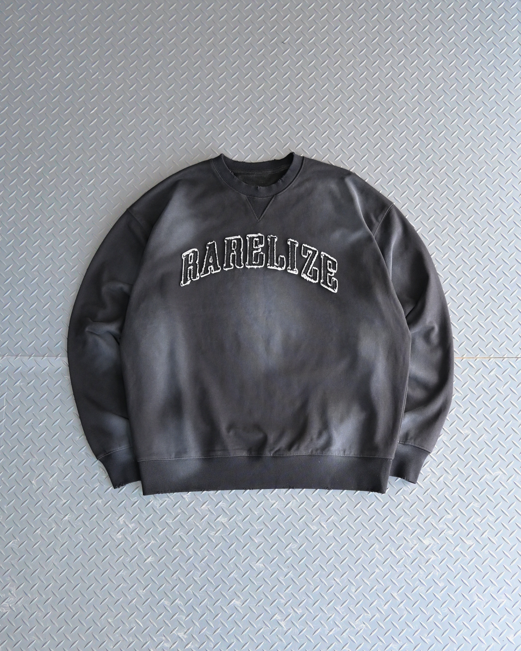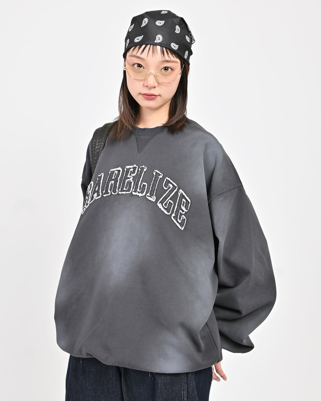 トレンド感たっぷりのウォッシュ加工を施したスウェットに、立体感のあるアップリケロゴをオン。