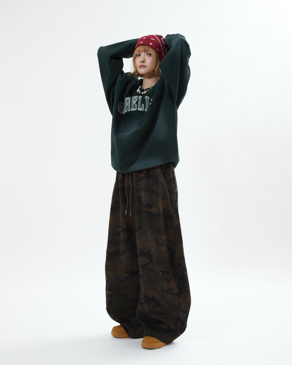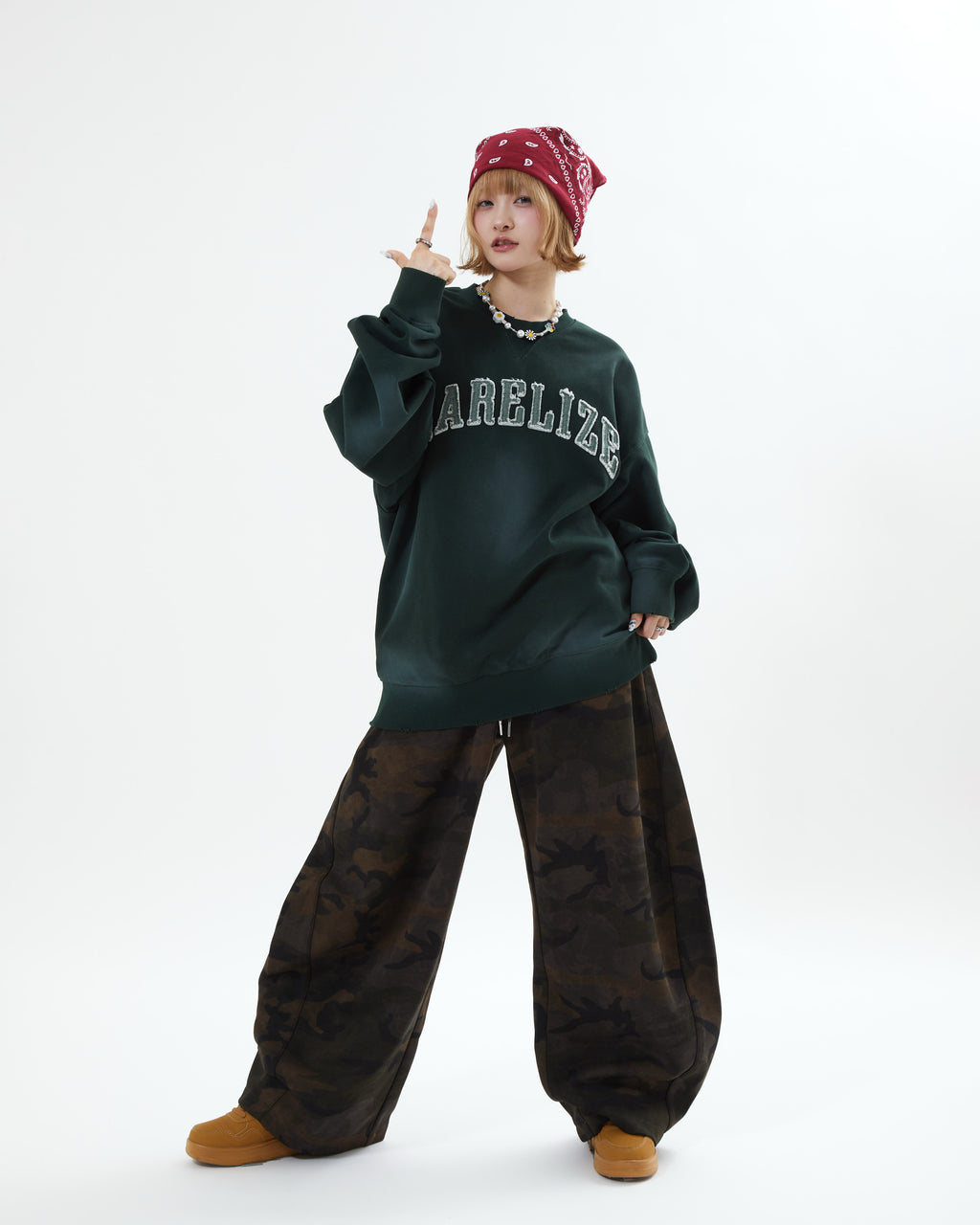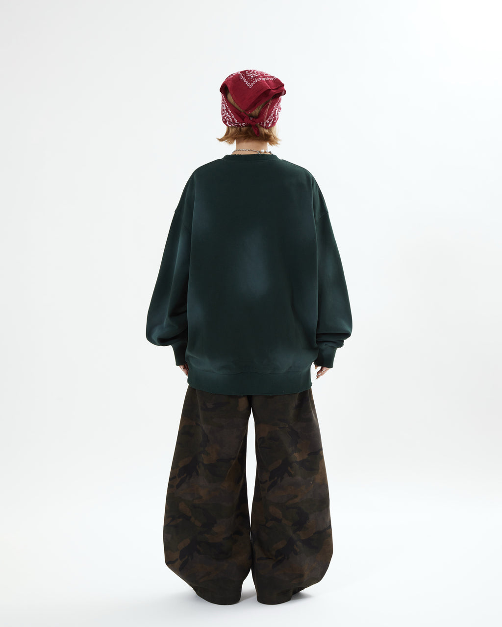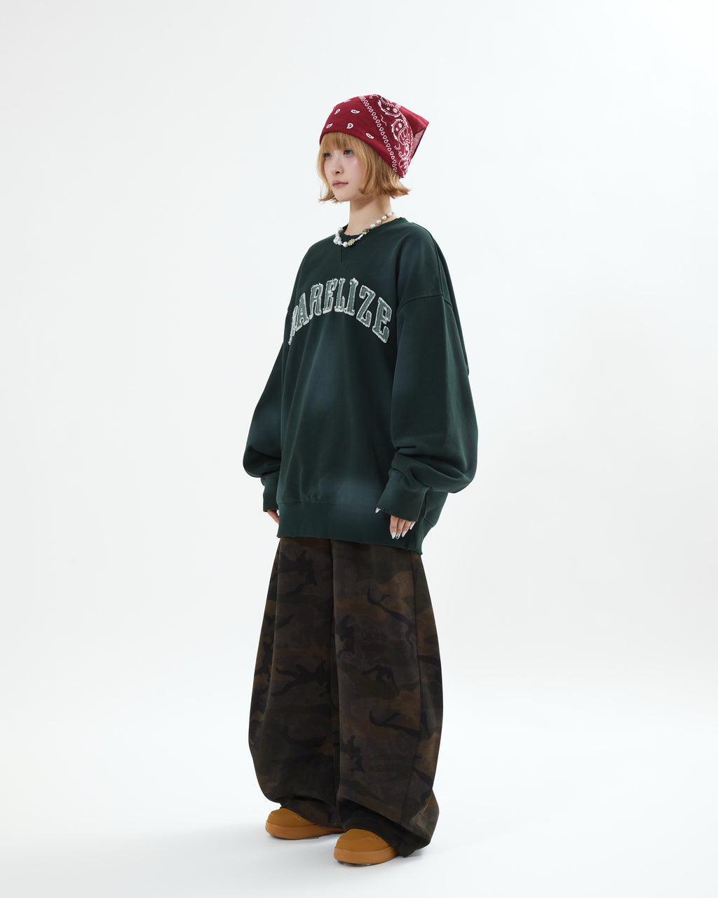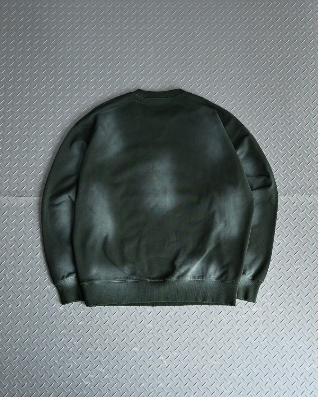 トレンド感たっぷりのウォッシュ加工を施したスウェットに、立体感のあるアップリケロゴをオン。