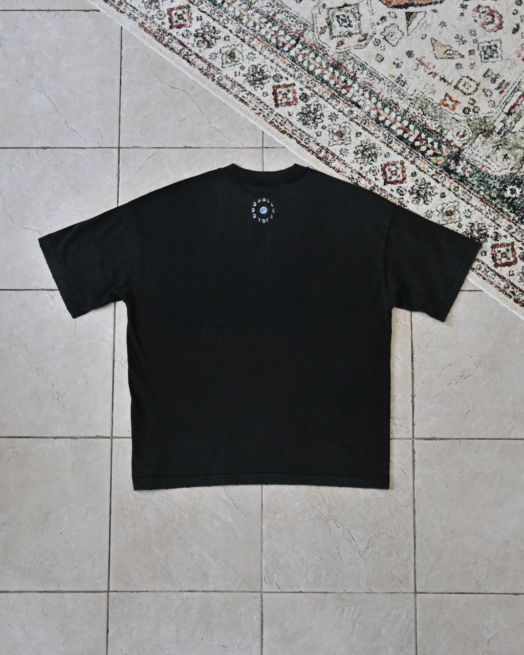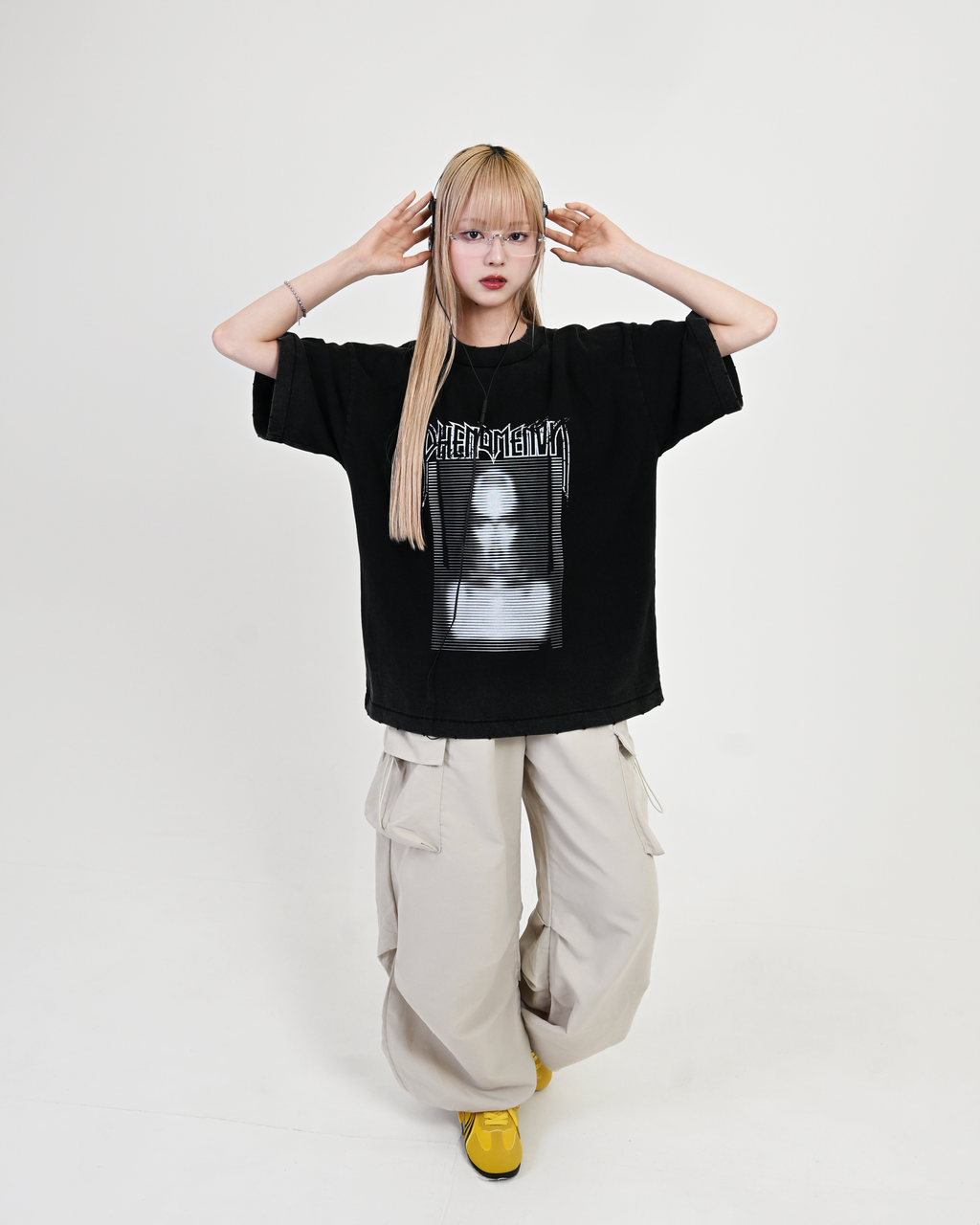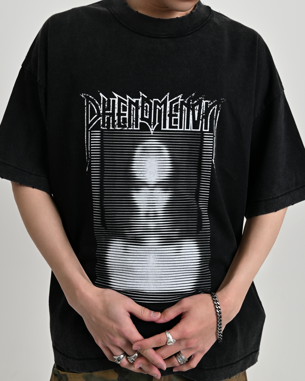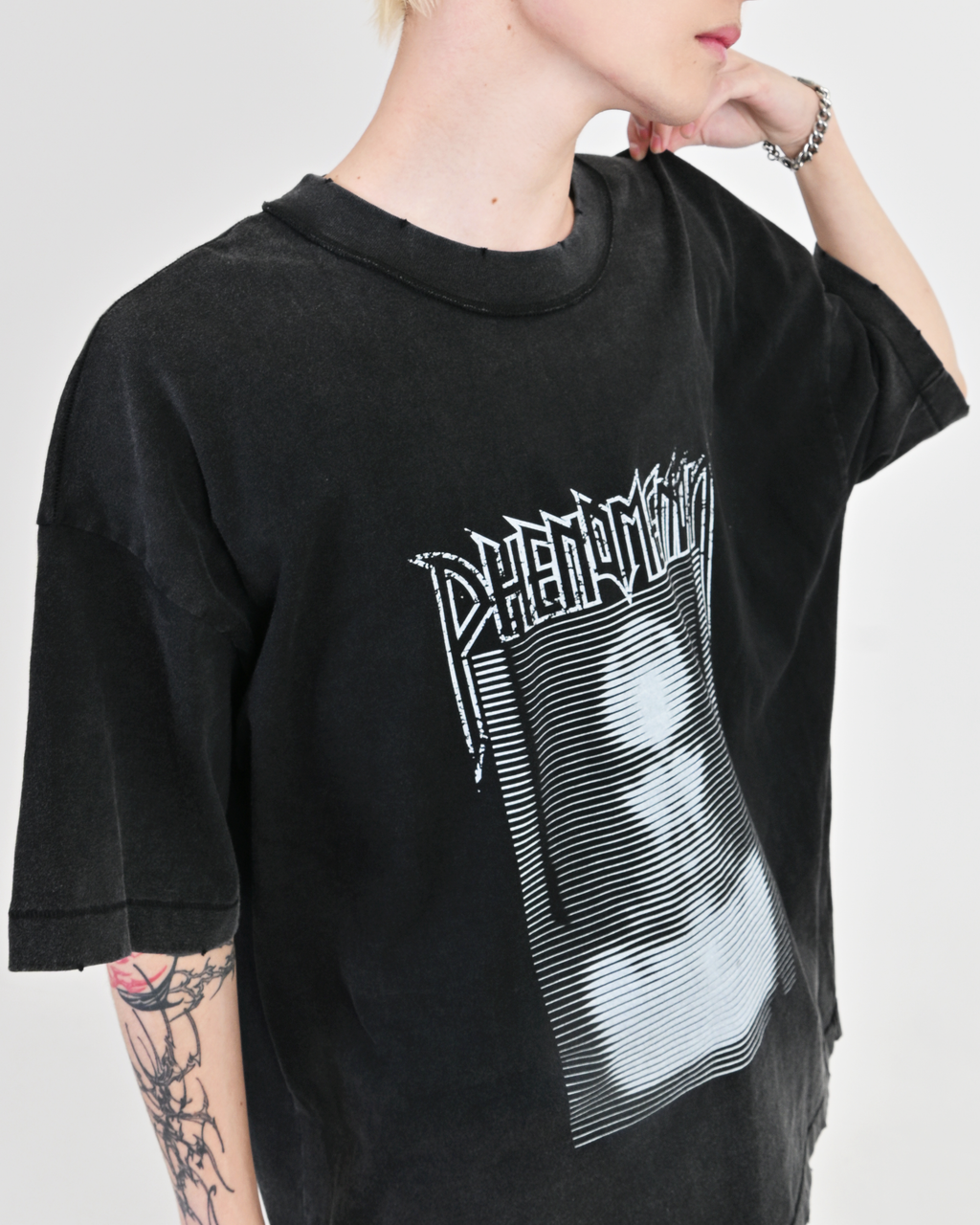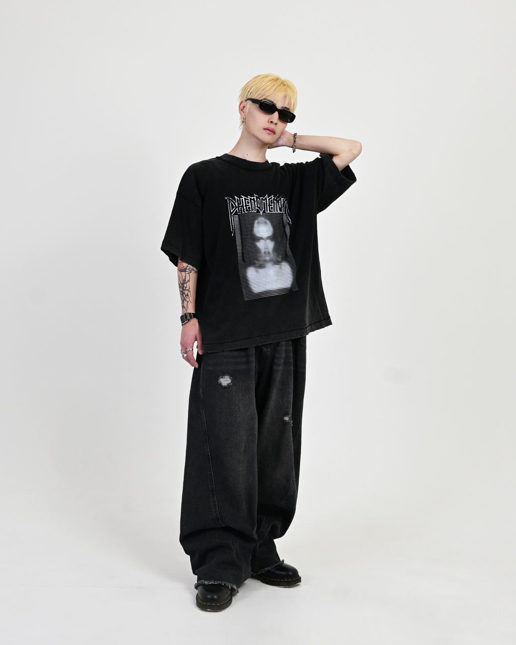 フロントに配置されたのは、地底人ONLINEのアイコンである“地底人”をモチーフにしたグラフィック。ノイズと歪みをかけたビジュアルは、唯一無二なスタイリングを実現してくれる。ボディはブラックを基調に、白プリントと調和するよう計算された白みがかったヴィンテージ加工を施し、リアルな経年変化を表現。