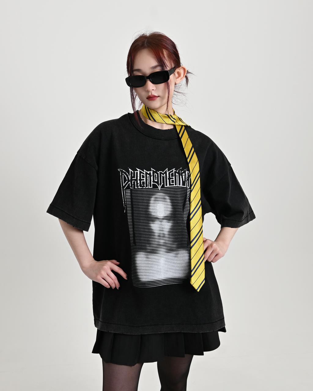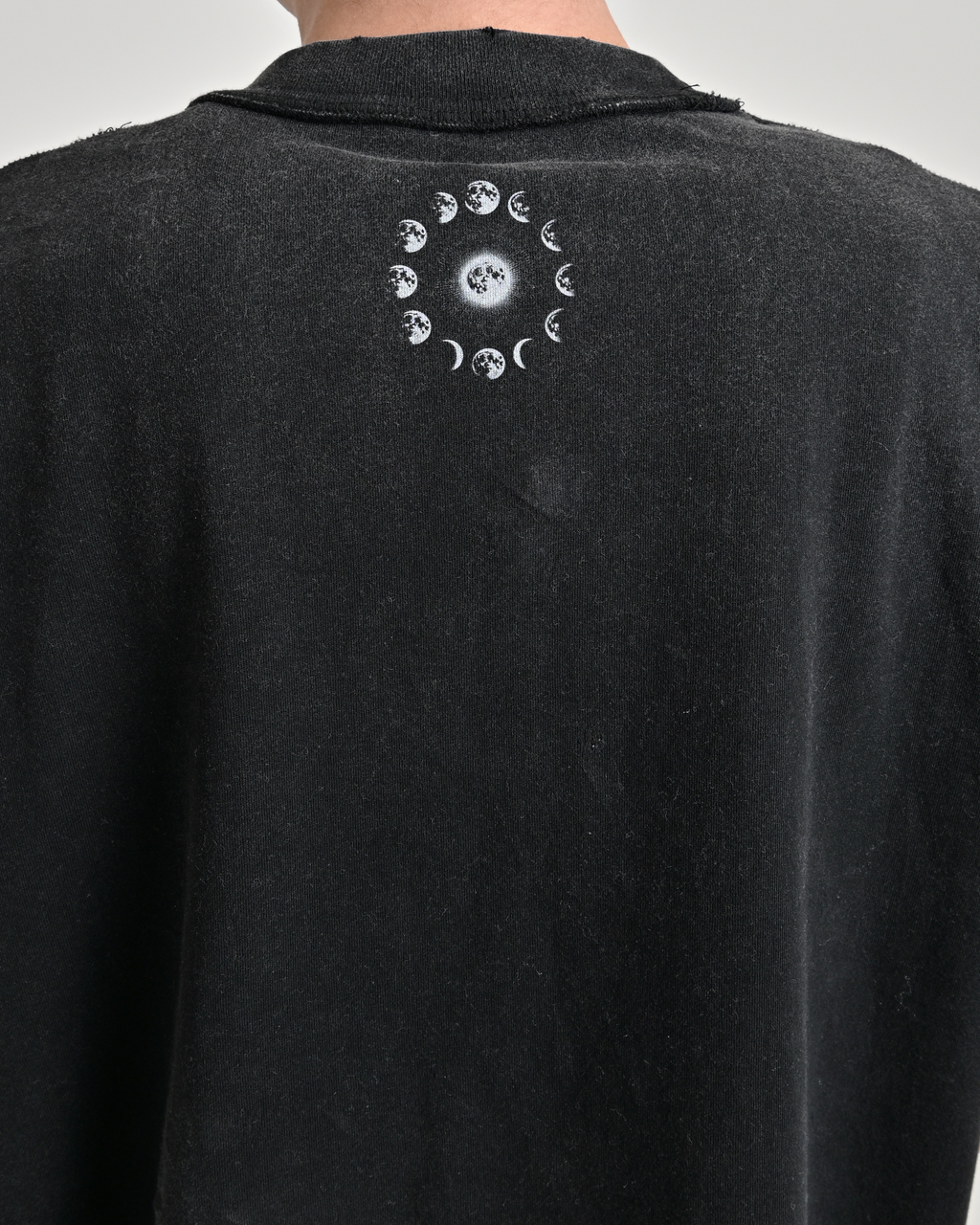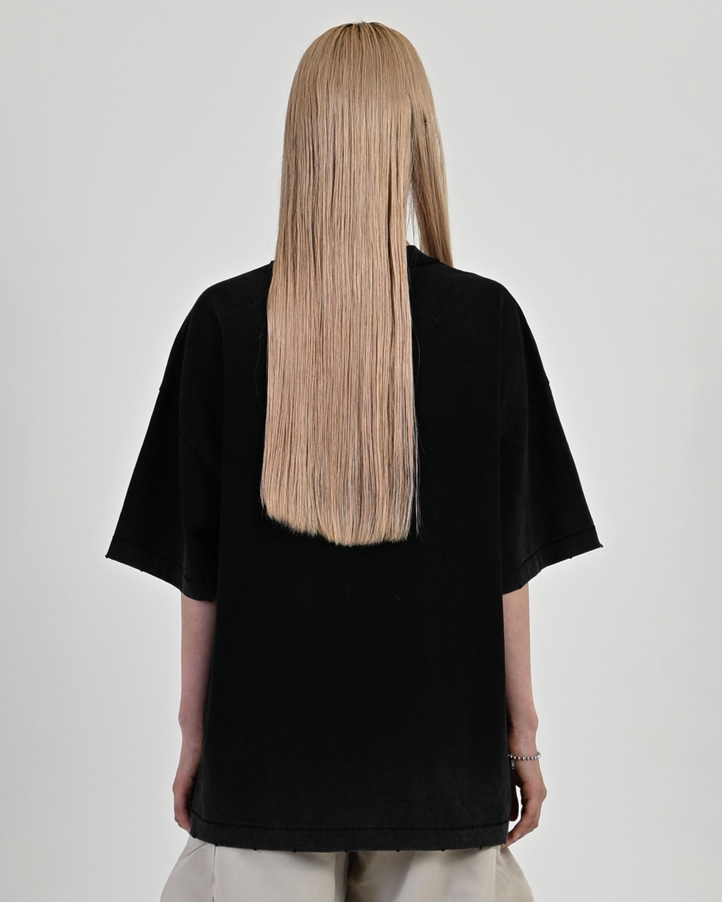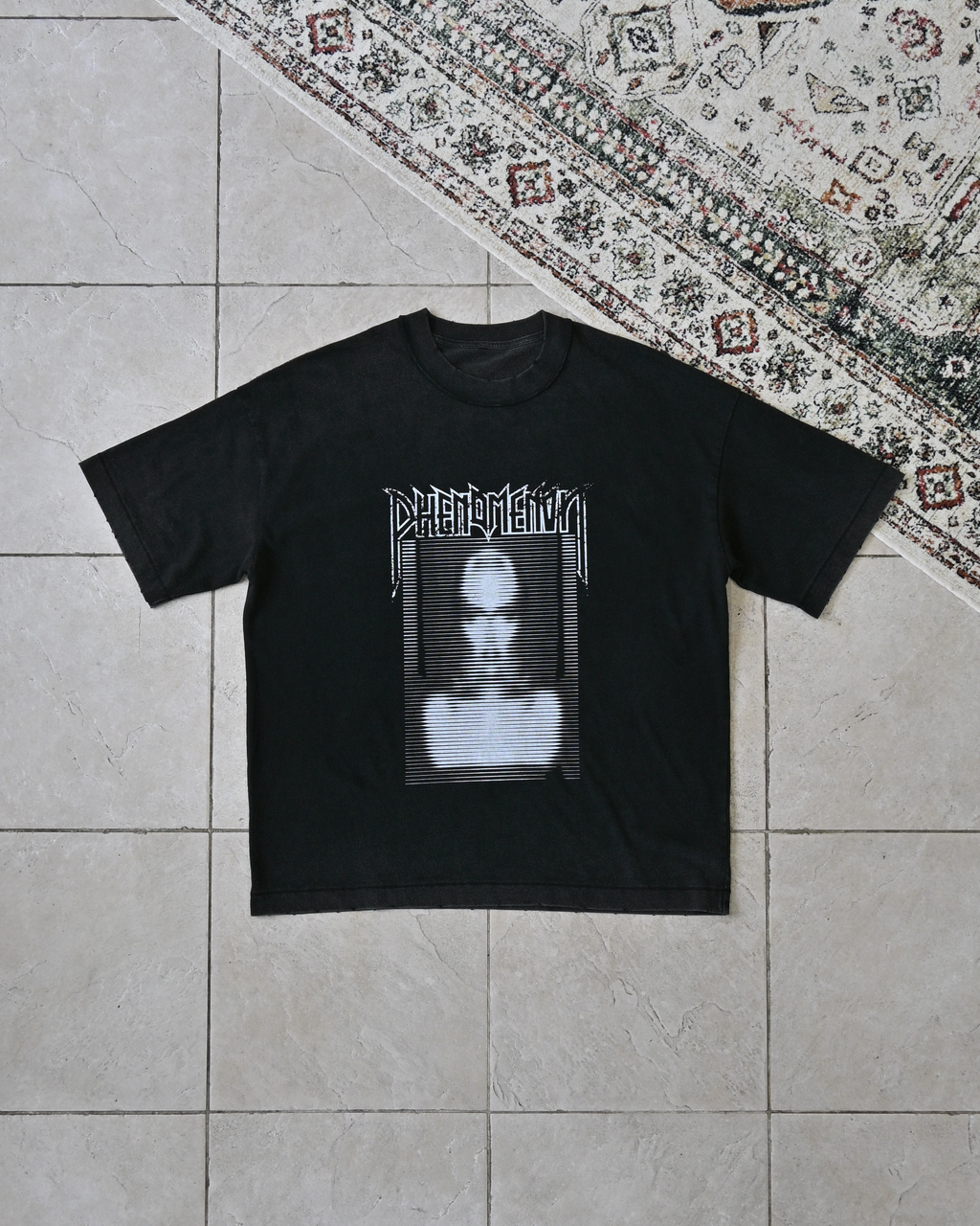 フロントに配置されたのは、地底人ONLINEのアイコンである“地底人”をモチーフにしたグラフィック。ノイズと歪みをかけたビジュアルは、唯一無二なスタイリングを実現してくれる。ボディはブラックを基調に、白プリントと調和するよう計算された白みがかったヴィンテージ加工を施し、リアルな経年変化を表現。