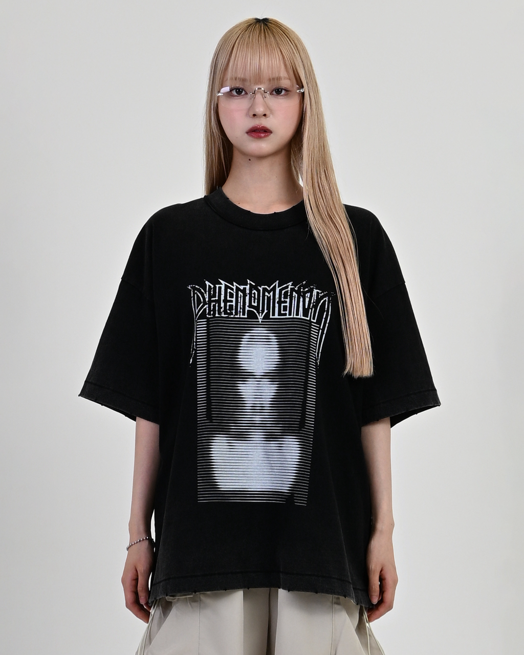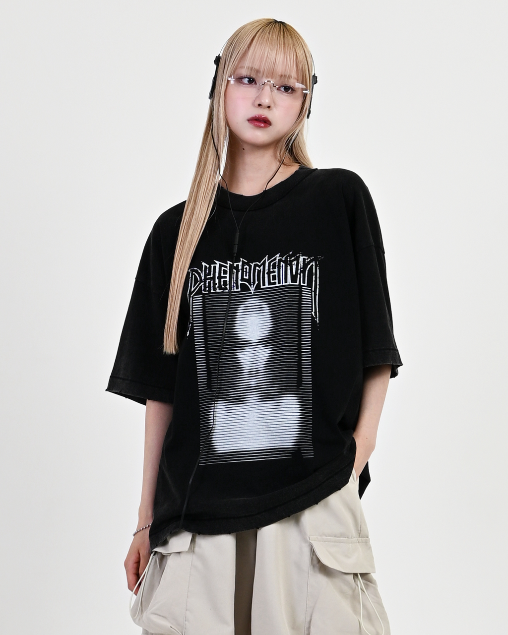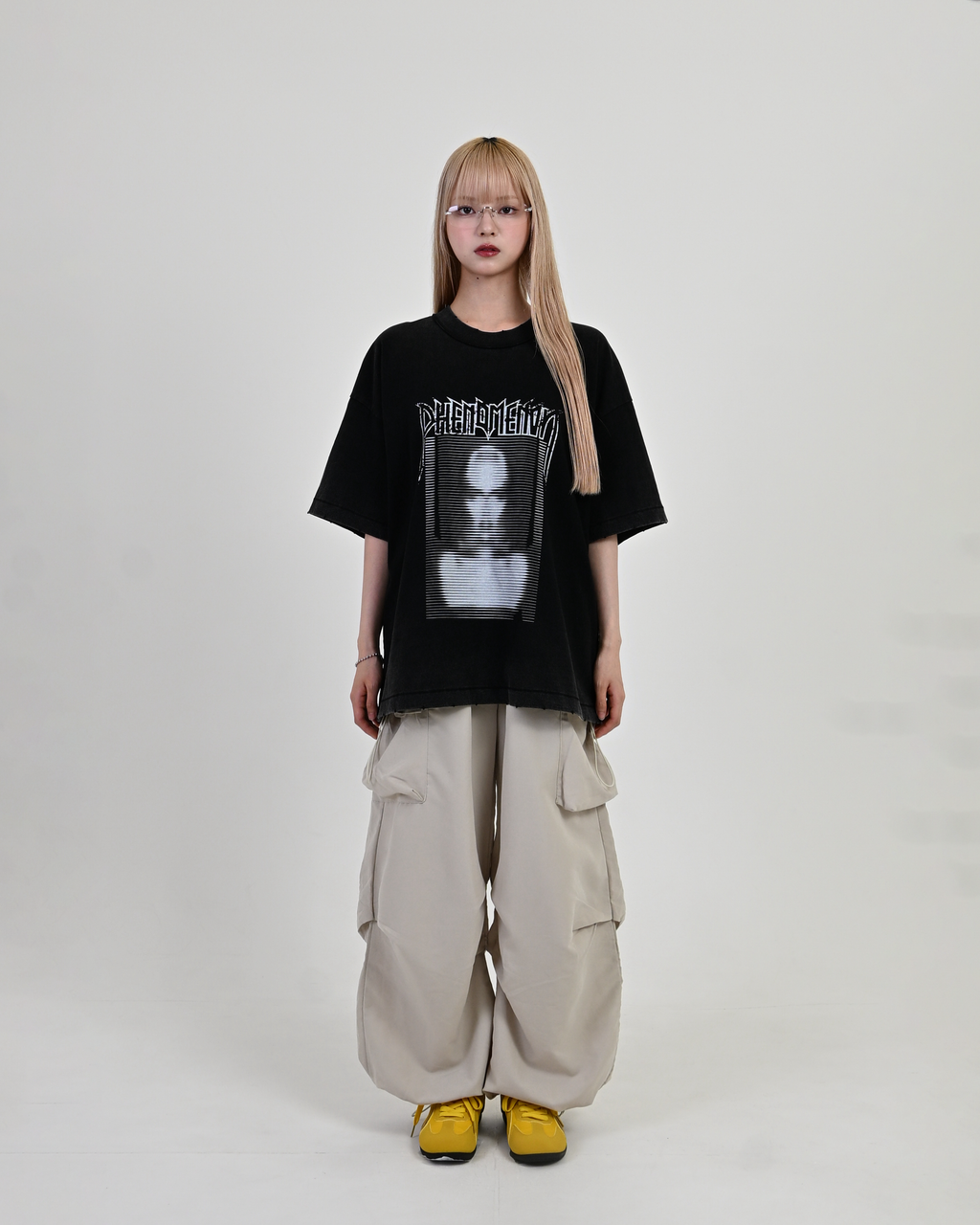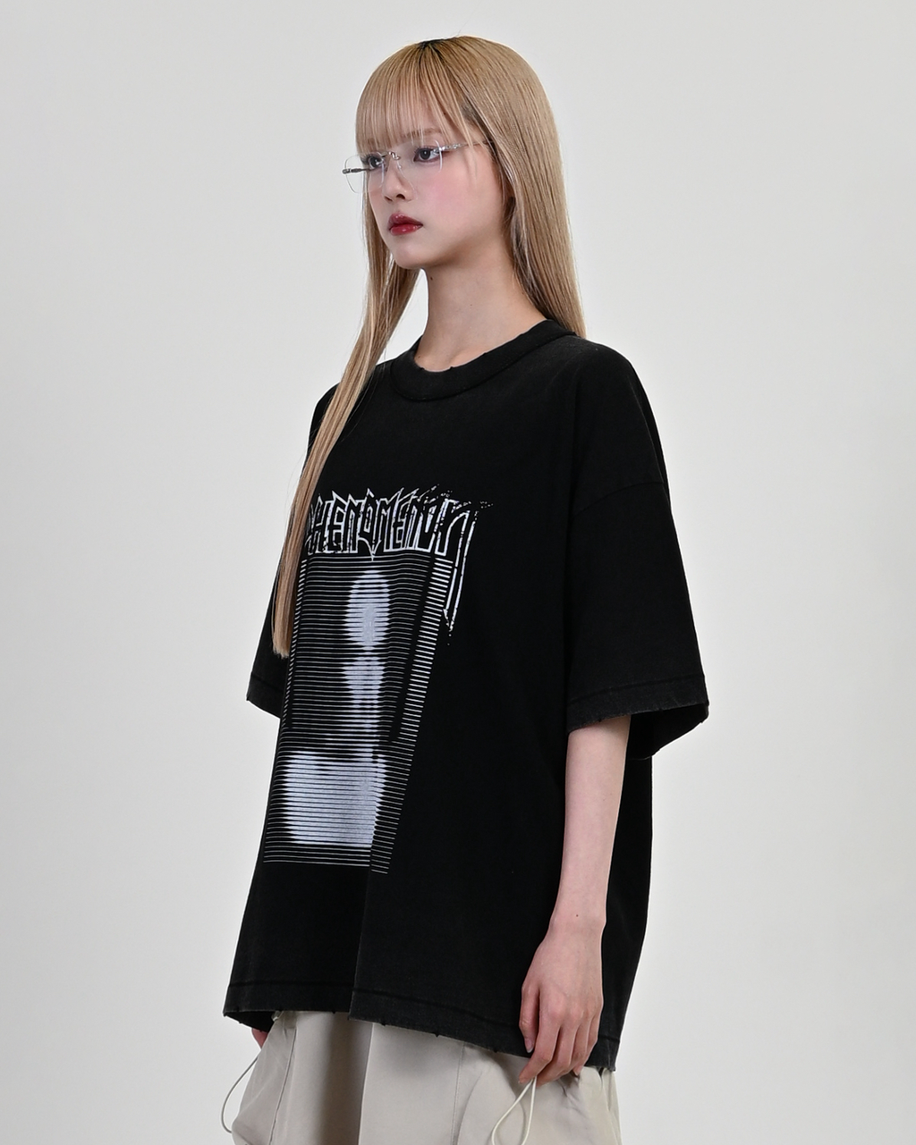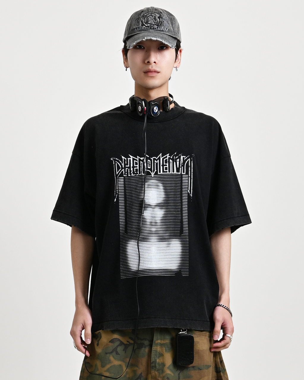 フロントに配置されたのは、地底人ONLINEのアイコンである“地底人”をモチーフにしたグラフィック。ノイズと歪みをかけたビジュアルは、唯一無二なスタイリングを実現してくれる。ボディはブラックを基調に、白プリントと調和するよう計算された白みがかったヴィンテージ加工を施し、リアルな経年変化を表現。