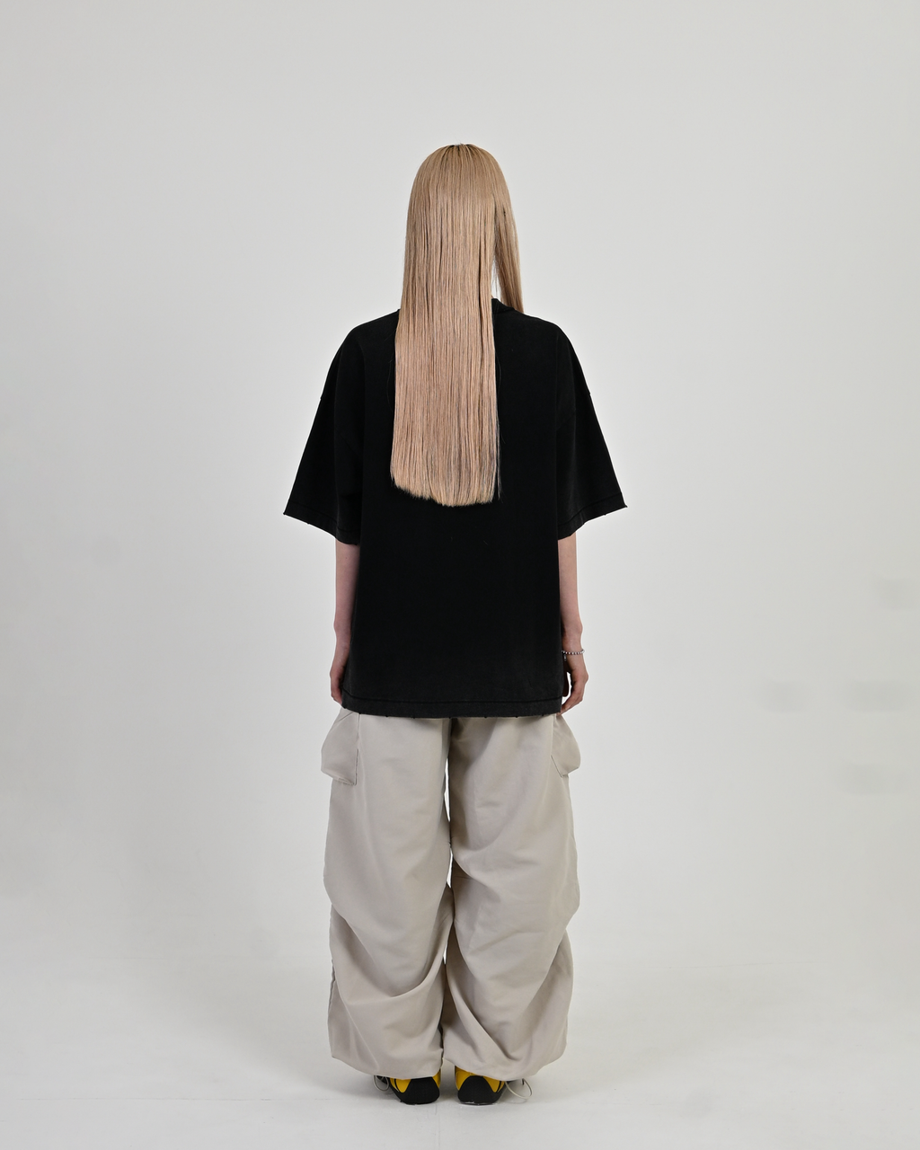 バックネックには、地底からの視点で描かれた地球を配置。ブランドの世界観を象徴するディテール。シルエットはワイドフィット。肩幅と身幅にゆとりを持たせ、性別やスタイルを問わず、ルーズに着こなせる万能な一枚です。