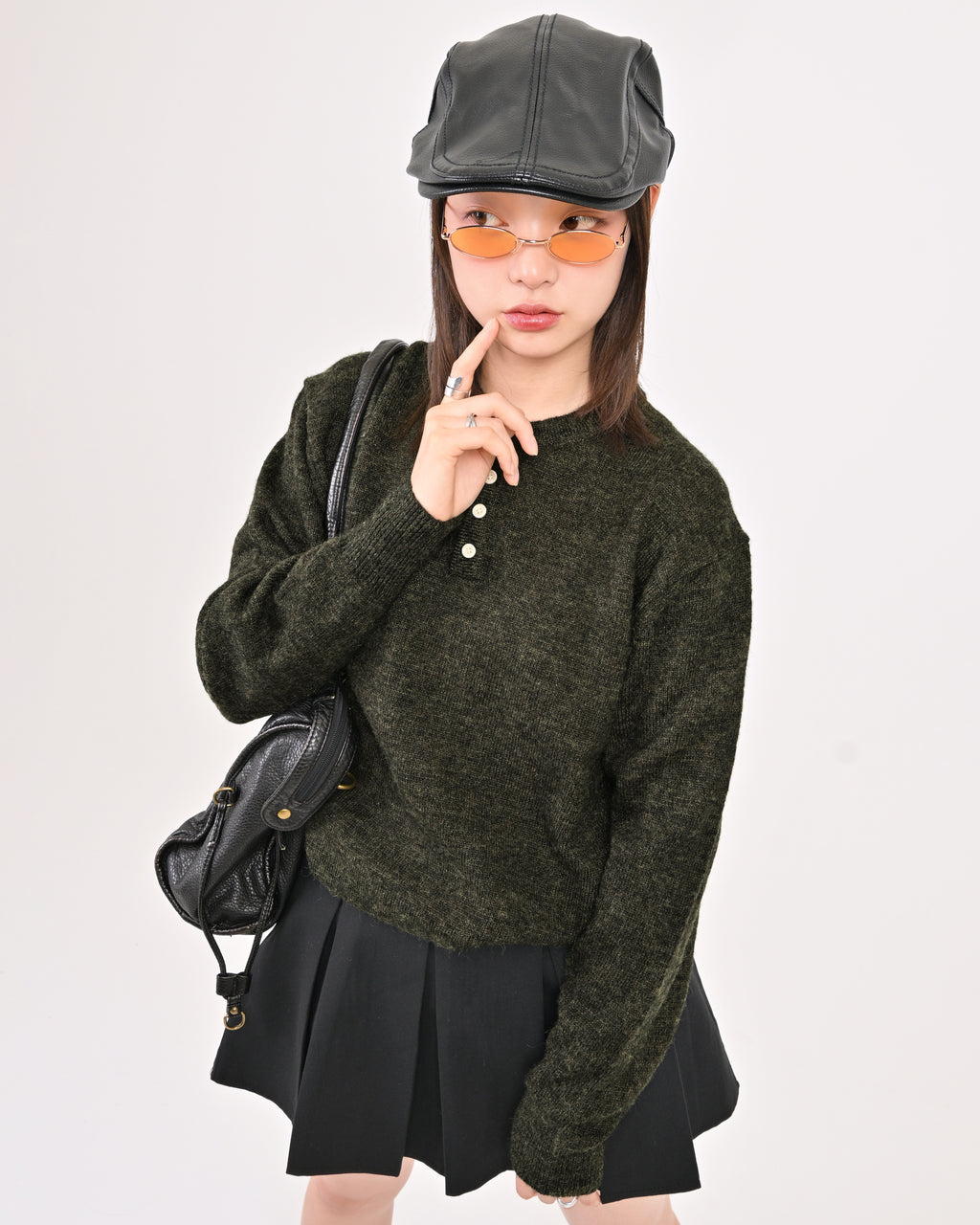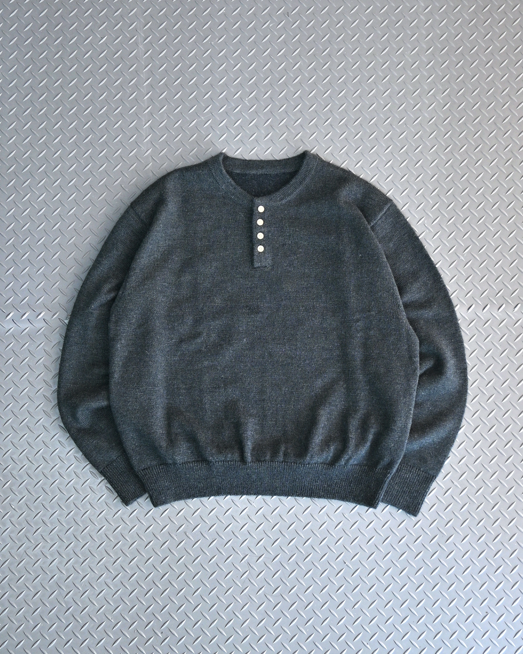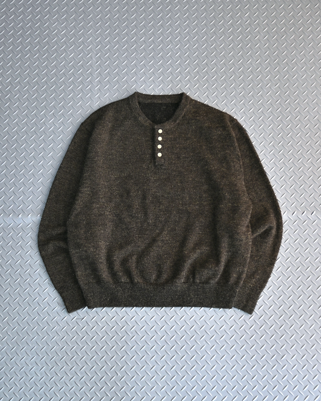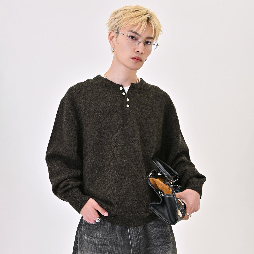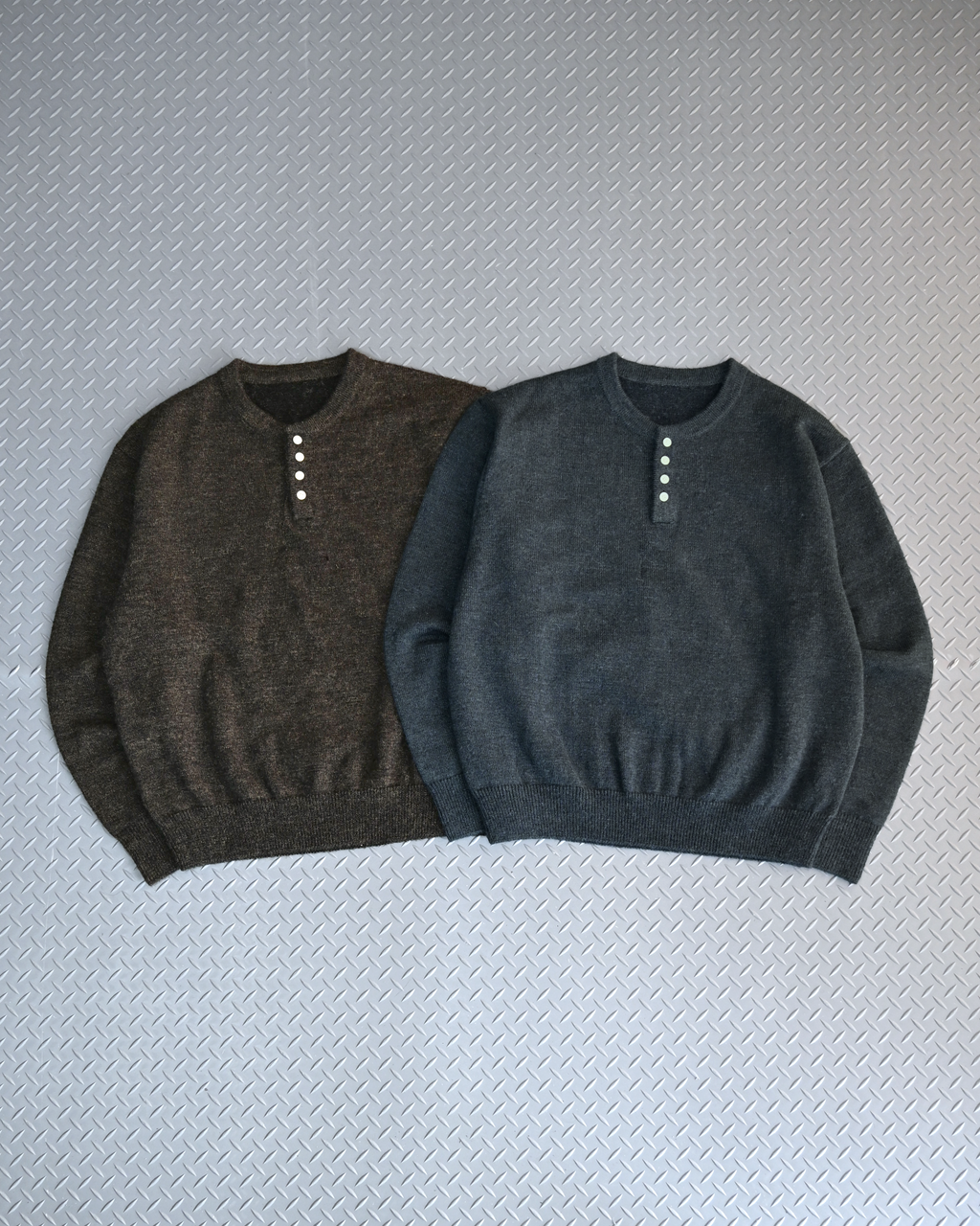 2色の糸を組み合わせたメランジニットに、トレンドのヘンリーネックデザインをプラス。