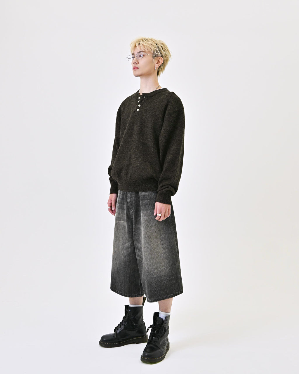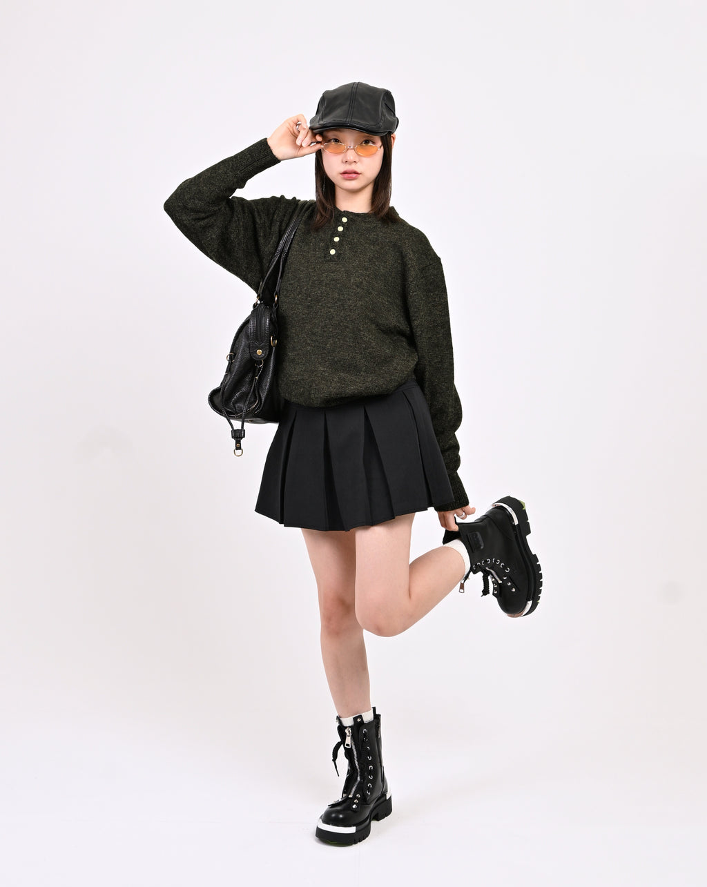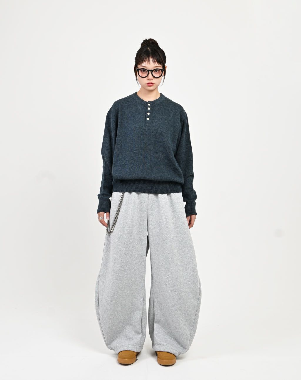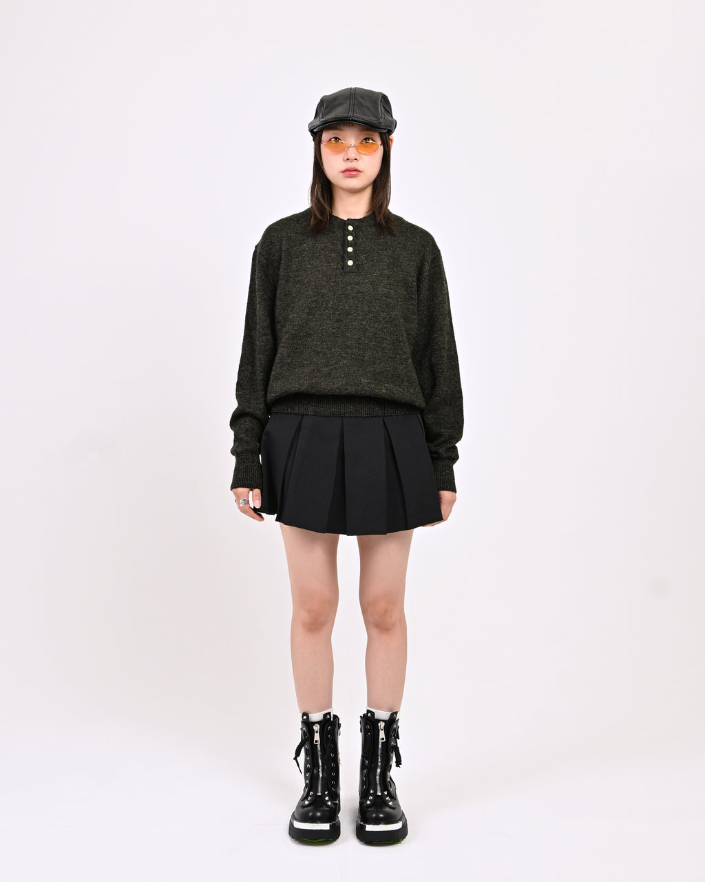 2色の糸を組み合わせたメランジニットに、トレンドのヘンリーネックデザインをプラス。