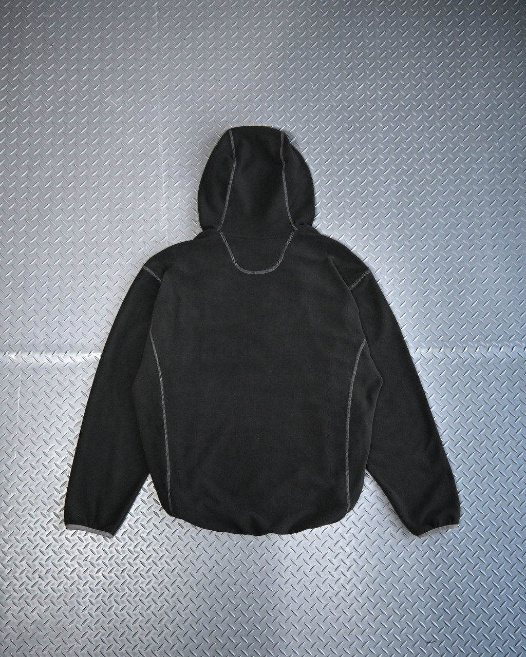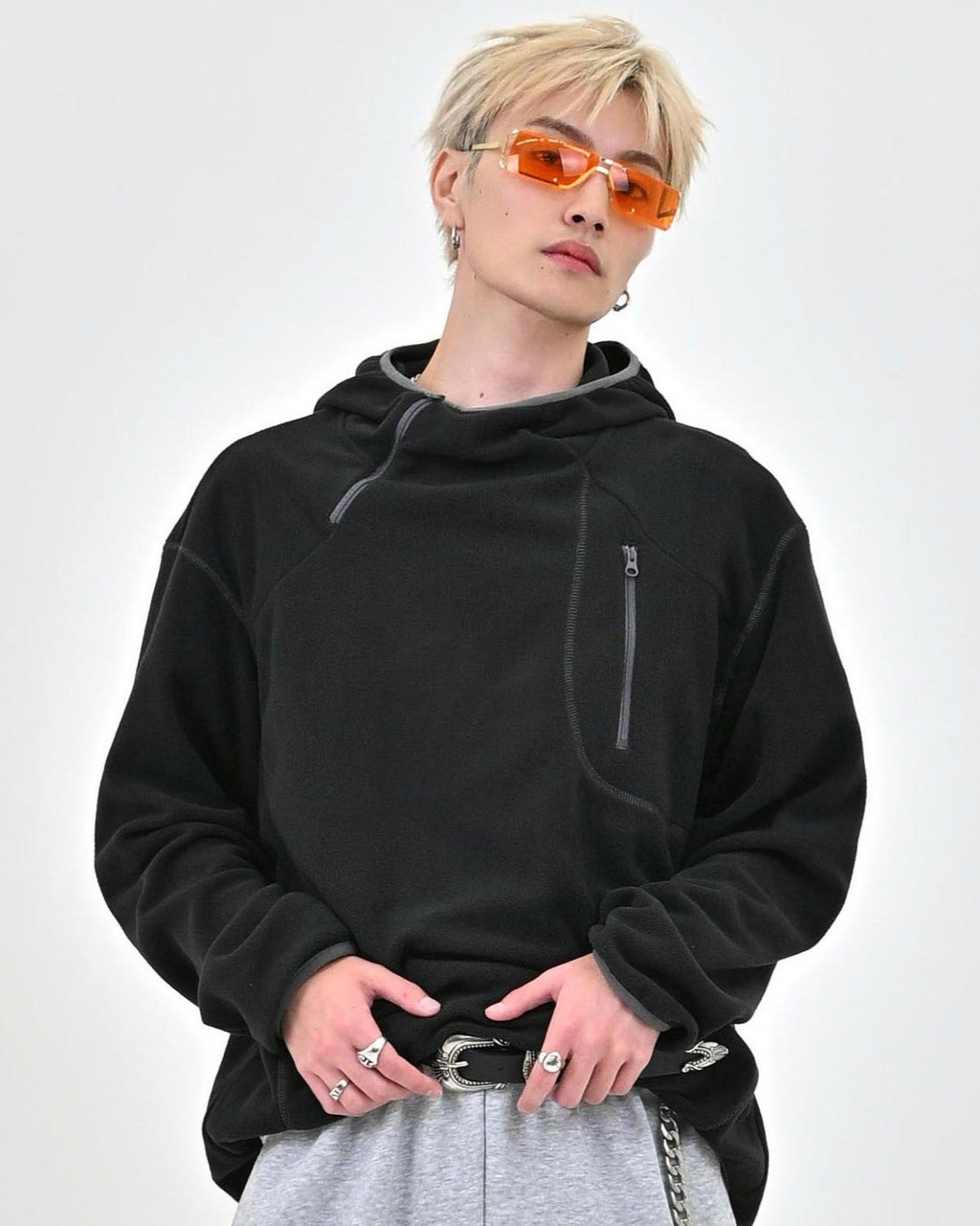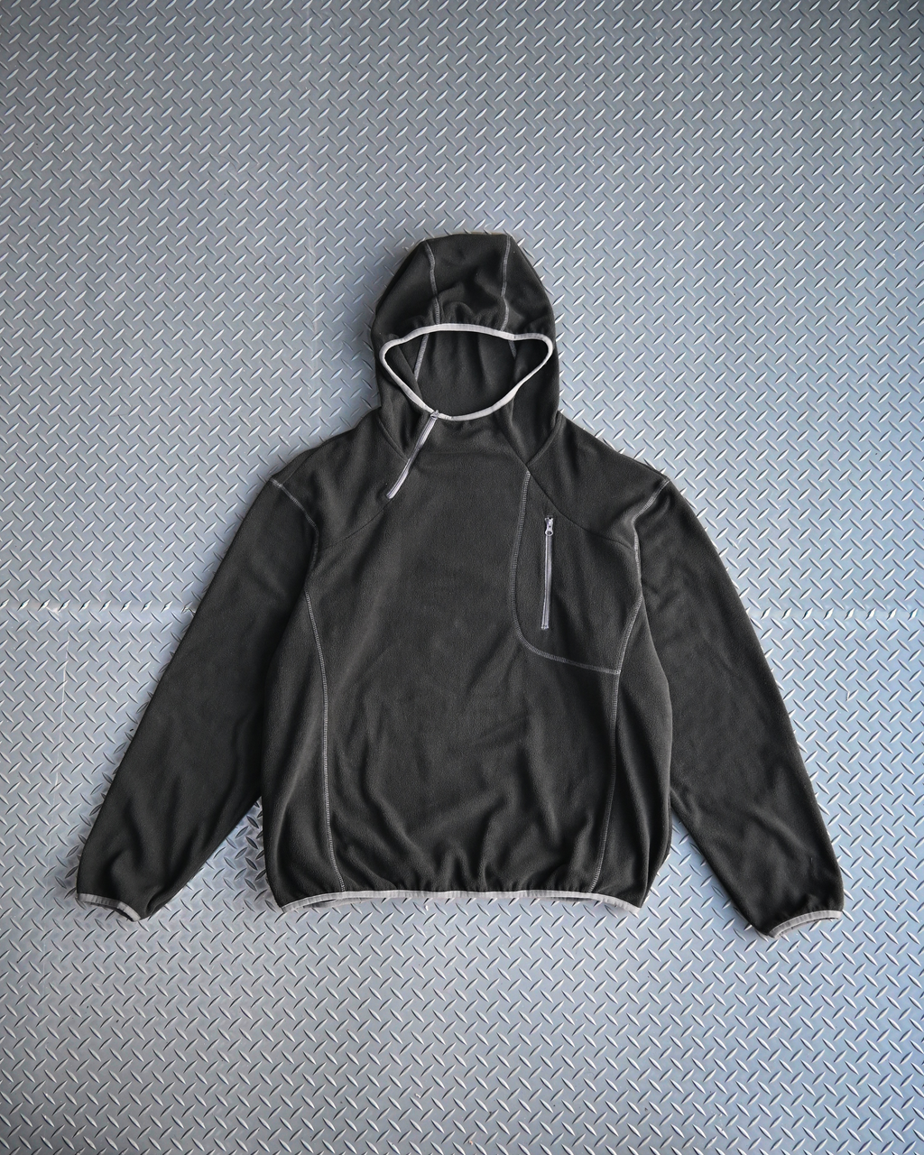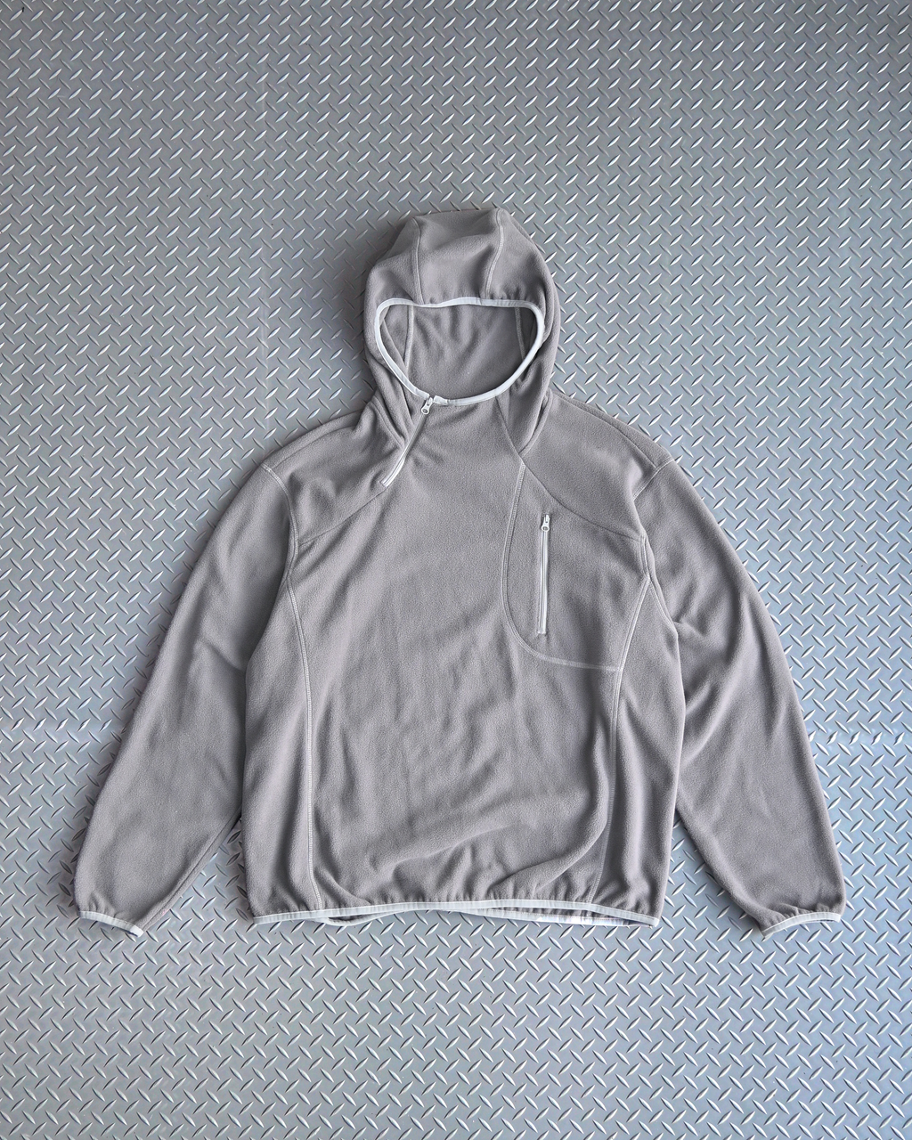 首元から胸元にかけてのジップデザインで、さりげなくY2Kテイストをプラスしたプルオーバーフリースパーカー。